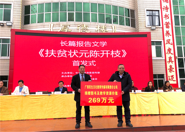 赠书仪式 张春梅 /摄 从1996年11月至2020年12月,陈开枝同志先后115 次到百色扶贫,发动社会爱心人士捐款助学,为百色老区引进资金5亿多元,新建改建学校246所中学、小学和幼儿园,帮助8万贫困学童重返课堂。