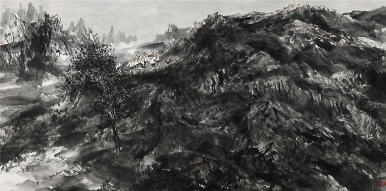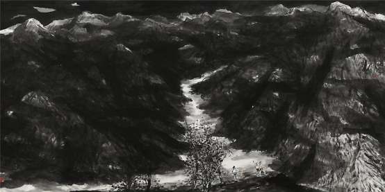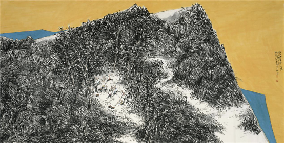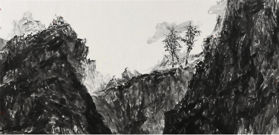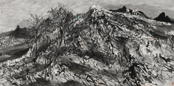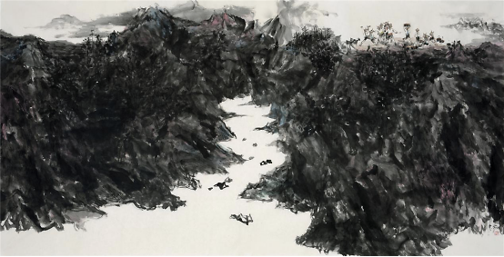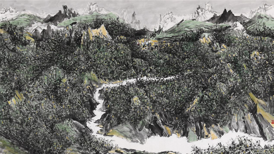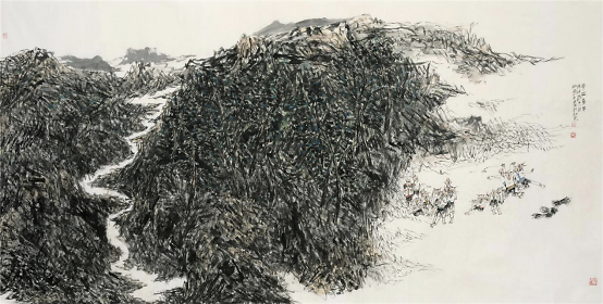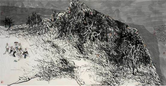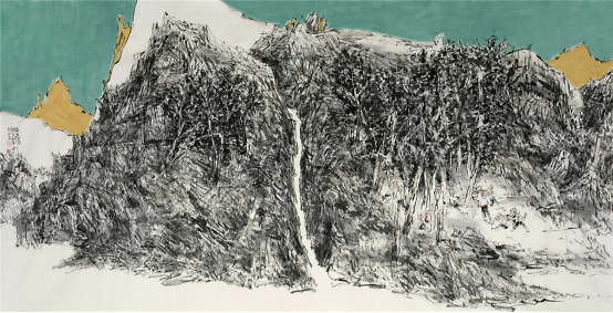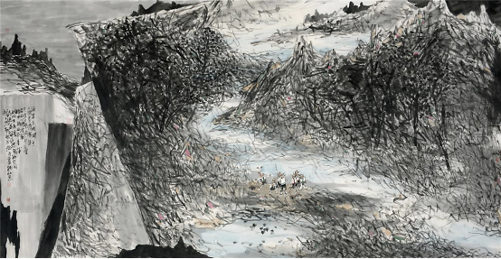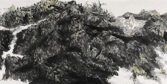2009年他开始山水画写生,祖国大好河山的壮阔深深地打动着着他,于是他开始尝试将这两个题材结合在一起,从最开始山水只用来点缀童子画到后来缩小人物,将山水的博大与孩童的美好两者和谐的融合在一起,他进行了多方位的尝试,生活视角的转换便是绘画形式探索的重要表现之一,从画面中只有童子到从更高处第三视角画童子,用更高的视角让童子藏于大山之中,却也不失生动,大山的静与孩童的动,有时甚至山水也动起来,动静相宜别具一番气象。同时更大视角的变化也是画家内心世界的的变化,那个世界是将所有美好都集中在他的画纸上。
