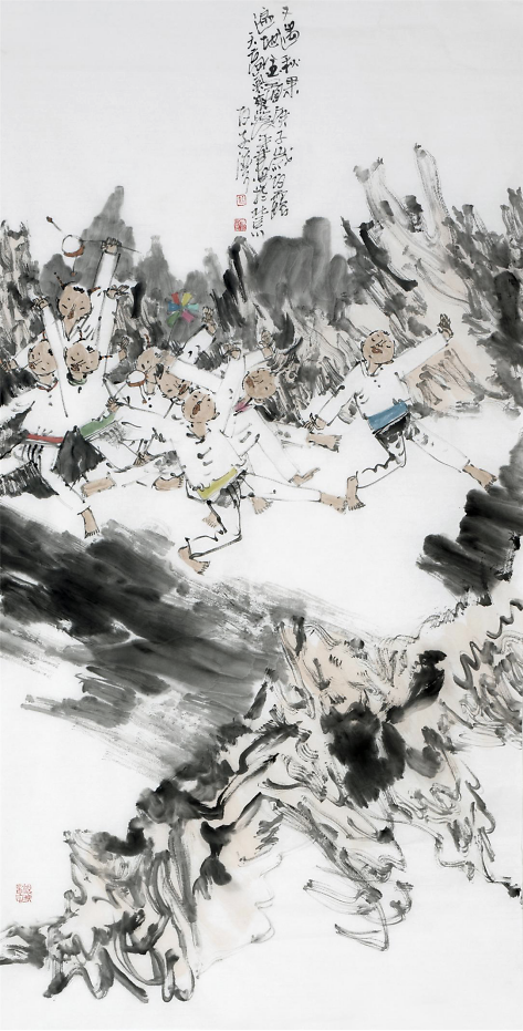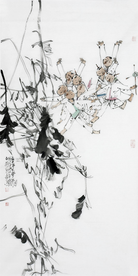 艺术来源于生活而又高于生活,郝爱平老师不仅仅追求第一视角表现孩子们欢乐的生活,同时也不断探索新的绘画形式,将童子与祖国大好河山更好的联系在一起。他从1992年开始有意识的画童子,起因源于画家母亲在幼儿园工作,童年在幼儿园的欢乐时光深深地留在了他心里,后来下放农村更是加深了画家的农村情结,加之多年对孩子的喜爱,画童子便是画家表达自己对生活认识的一部分,在表现手法上他认为童子应该一样,没有贫富贵贱阶级之分,中国传统文化就有招财童子、童子抱鱼一说,孩子对人们来说也代表着对未来的想象以及无限的期望,他力求用更自由的手法表现孩子单纯、活泼好动的一面。