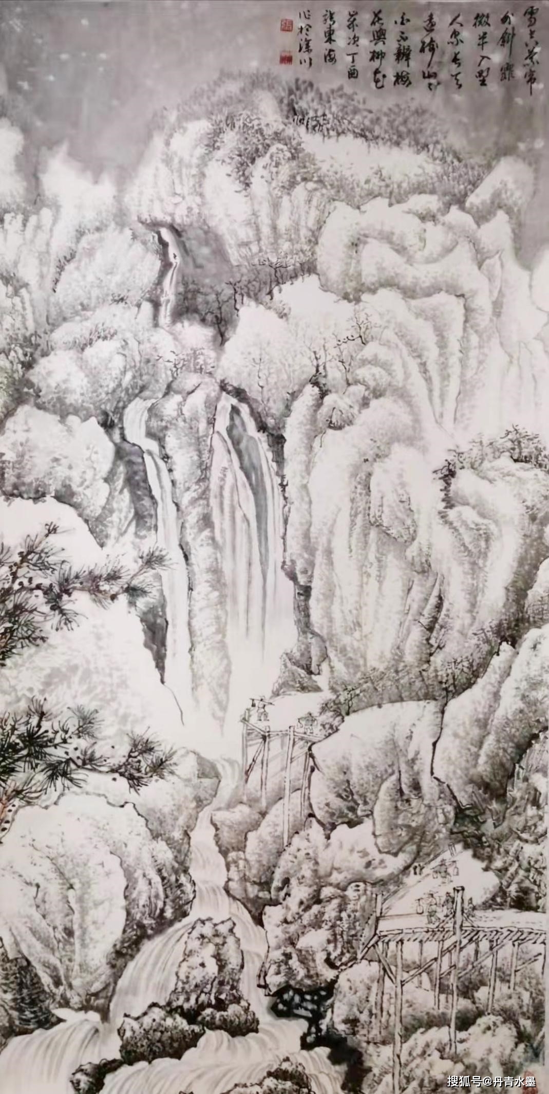 笔法和墨法先有相互独立的写意空间,既让画面产生了用笔神奇的力量感,也让画面中产生着浓淡相染的色墨气韵感。然后又以身心聚力把笔墨融为一体,通过勾勒与皴擦,把墨与色调节得互不相害,在色不碍墨,墨不碍色的情景渲染中,让石崖、飞泉、云烟、人物、小路、林松一一描写细腻,有写真之妙,也有传神之趣。只看石如飞白的质韵表现,就知是元代文人画的深师传承。用笔墨致敬传统的笔墨法力,烘托出当代文人画的韵味气场,笔墨自成金刚杵,丘壑空远有禅风!