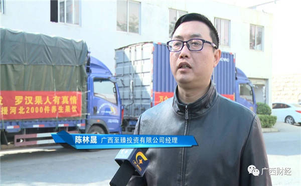 广西至臻投资有限公司经理 陈林晟 全国各地的医护人员都义无反顾的奔赴前线支援,作为一家有社会责任感的爱心企业,我们也要表达我们的关爱和支持,我们将送去我们广西特有的有润肺排毒的广西特产罗汉果给一线的医务工作者。希望我们这批罗汉果饮料,能够给河北一线的医护工作者带去广西的爱和支持。