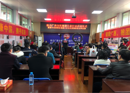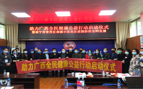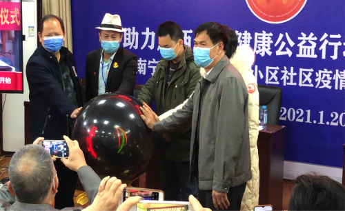 1月20日上午,由广西数十家社团、企事业单位和媒体发起的“助力广西全民健康公益行动”启动仪式暨南宁南湖社区疫情防控全网直播活动在南宁南湖社区隆重举行。自治区有关老领导,南宁青秀区津头街道办、南湖社区、医疗健康行业社团领导,医疗专家教授、社区居民代表、社区企业家代表、公益志愿者和部分新闻记者、现在直播人员参加了本次活动。