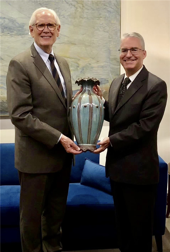 --《易传·系辞上传》。中国人宗尚天圆地方,阴阳五行,天干地支,青龙白虎,朱雀玄武等,最具文化特色,应该从中汲取灵感。受此启发,大宋官窑·荣昌钧瓷坊精心创作出了"祥瑞瓶",就是皆在呼唤世界和平,天下大同。当时美国总统布什等收藏,同时受到与会各国元首的普遍欢迎,取得了巨大成功。后来又陆续为博鳌亚洲论坛创作出了国礼"乾坤瓶","华夏瓶",季羡林老先生知道后所然题词: "祥瑞、乾坤,华夏皆钧瓷之魂"