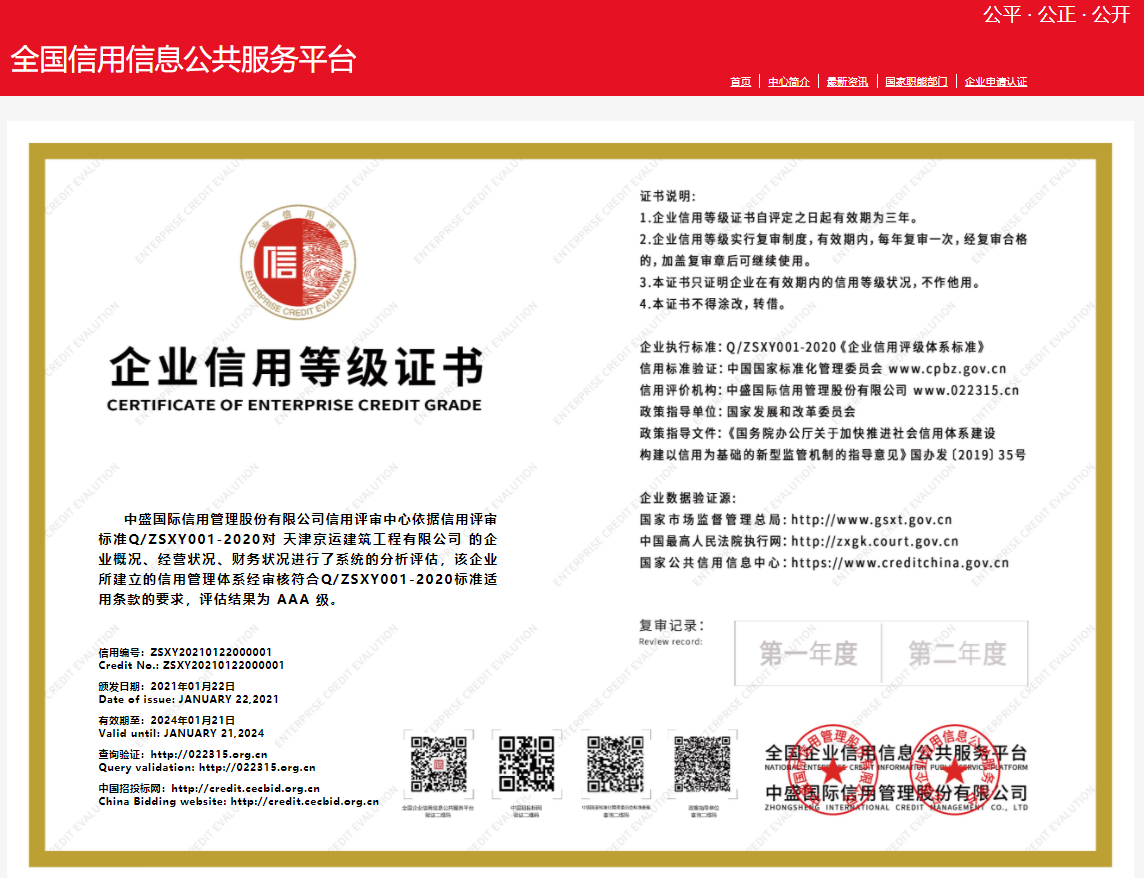 2021年01月22日,由专业的第三方信用服务机构、全国企业信用信息公共服务平台、中盛国际信用管理股份有限公司通过国际通行的“四等十级制”评价等级对天津京运建筑工程有限公司进行多维度考核,评价要素主要包括基本条件、企业状况、经营管理能力、财务状况、信用记录等方面进行综合信用评价,通过信用评价办公室初审、专家评审委员会审定,经严格评选之后最终确定。