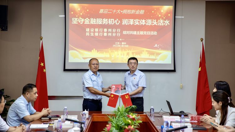 ——建设银行泰州分行与民生银行泰州分行开展联学共建活动 7月18日下午,建设银行泰州分行与民生银行泰州分行开展以“坚守金融服务初心,润泽实体源头活水”为主题的联学共建主题党日活动。集中观看了建行离休干部张富清老英雄先进事迹纪录片,进行了赠书仪式,并交流了学习体会。