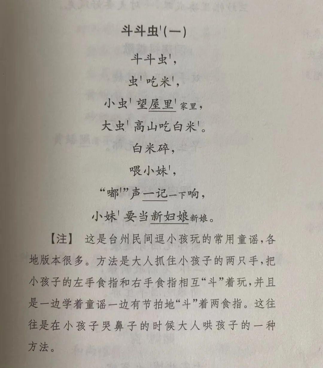 我家小孩特别喜欢书里的歌谣,可惜她基本上没说过方言。一则早年在台州大地上广为流传的《抖抖虫》,被她生生念出了日韩味。我彻底打消了让她参加班级演出说方言段子的念头。不会讲方言,人生真的少了很多乐趣。比方我现在和同学见面,大部分是方言交流,精炼、生动、传神、风趣、深刻、土味十足,表达生活的家长里短、传递喜怒哀乐,有着普通话代替不了的妙趣横生。有时候因为某个话题争执不下时,我们会自嘲地抛出一句:“没汤洗脚夹燥辫”,然后哈哈大笑,一扫尴尬。