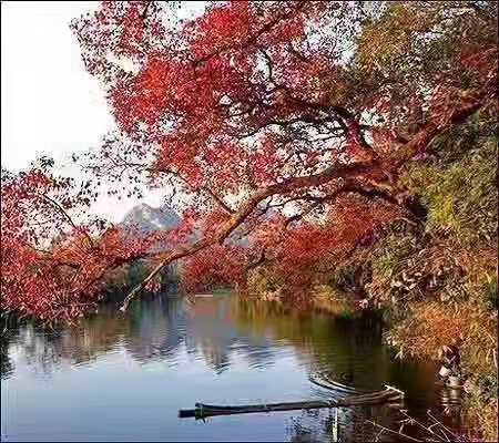 忆与友人秋游漓江 那年十月沐秋风,携友泛舟漓水中。 雨后群山尤翠绿,霜来枫叶正金红。 画廊百里迷游客,烟树孤洲醉钓翁。 转眼青丝成白发,几多岁月与君同?