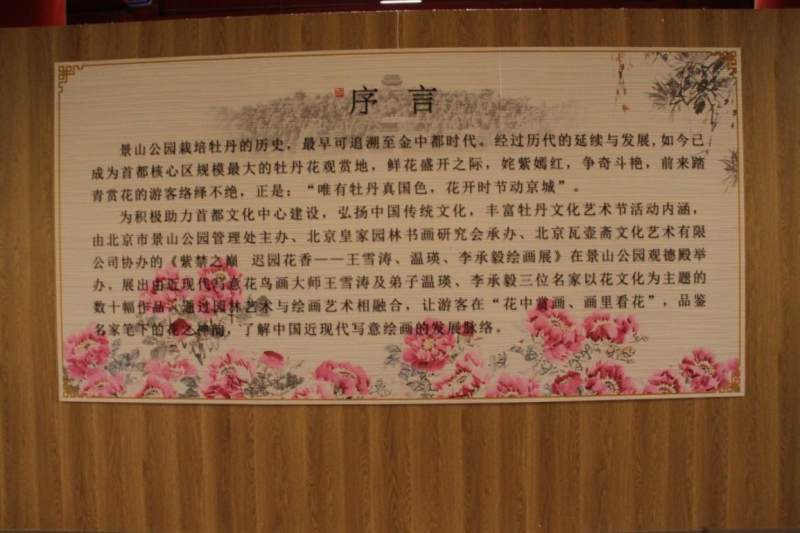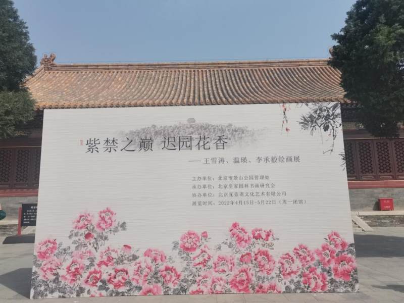 为丰富春季文化活动,由北京市景山公园管理处主办,北京皇家园林书画研究会承办,北京瓦壶斋文化艺术有限公司协办的《紫禁之巅 迟园花香---王雪涛、温瑛、李承毅绘画展》在景山公园观德殿举办。展出由写意花鸟画大师王雪涛及弟子温瑛、李承毅等三位名家以花文化为题创作的数十幅作品。“花中品画、画里赏花”,使游客观赏牡丹怒放风姿的同时,品鉴绘画名家笔下花之神韵,体会中国近现代写意画的发展脉络。