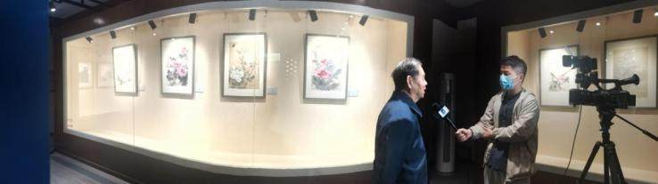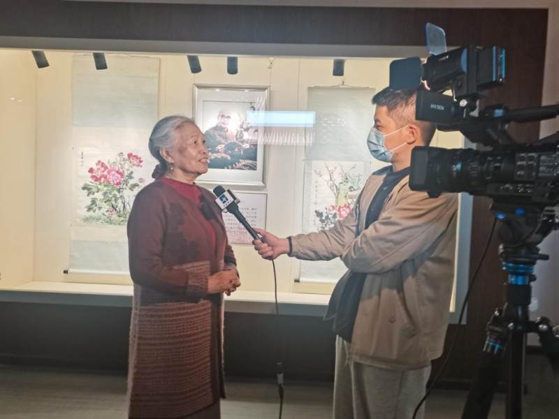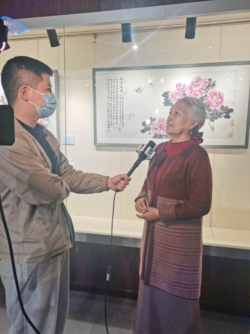 (温瑛女士在接受采访,介绍王雪涛先生作品)