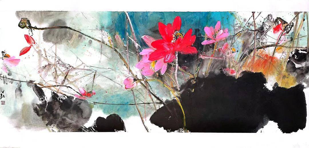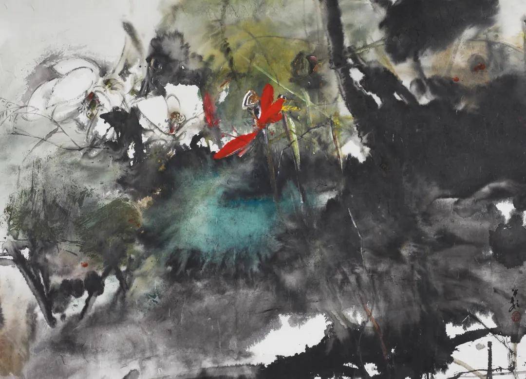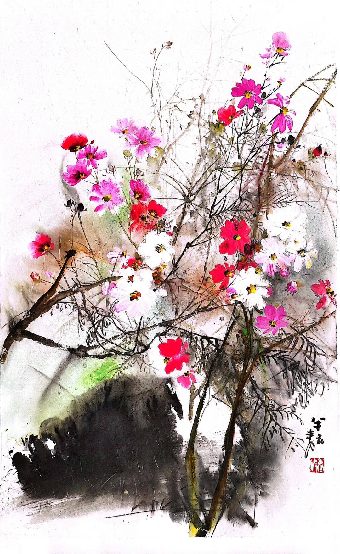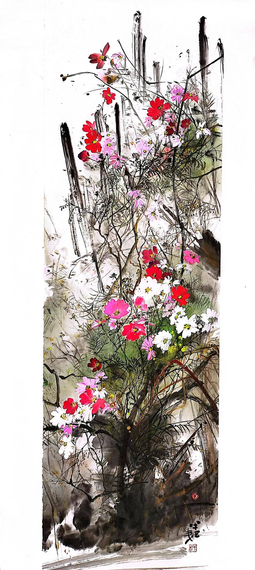 袁波画风的变化是在日本定居10年之后。这个时期,他开始画恬静的花朵,画各种鲜花间流淌的春意,蜜蜂的低鸣变得轻柔,秋英在枝头也不再伤感。虽然画得是写意花鸟,但日本画中的拘谨和刻板却没有影响到袁波,中西方文化的交融,让他的画风愈加洗练旷达,在他的艺术境界里看不到狭窄和文弱。