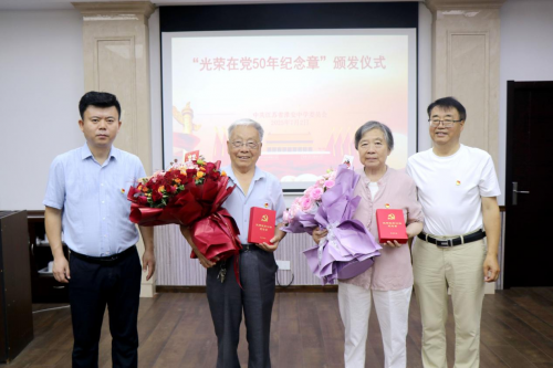 仪式上,于敏校长为陈元忠、成林等老党员颁发“光荣在党50年”纪念章并献上鲜花。