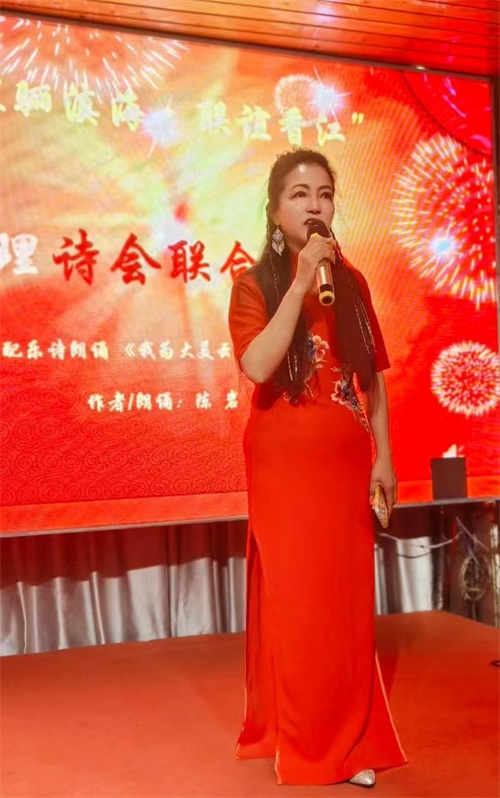 席间,诗人陈岩登台诵出自创篇章《我为大美云南放歌》,声情并茂间,把云岭大地的山川灵秀、人文深厚凝于笔端,情真意切,满场动容。(上图.大理诗会主持人之一:陈红)
