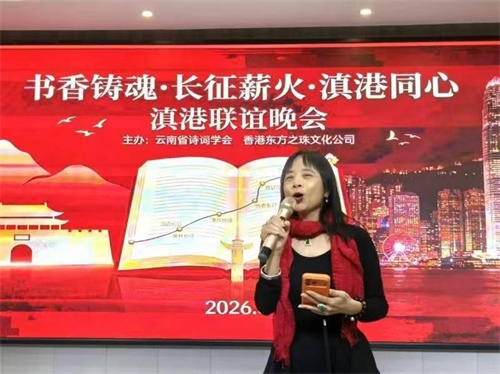 西北大学丝绸之路国际诗歌研究中心副主任、华语诗歌春晚副总策划、《中华诗园》主编安娟英表示,首先深深感谢来自各地的新老朋友。本次滇港文化交流峰会以书香为媒、诗词为韵,联结全民阅读、长征红色精神与滇港地域文化,为中华诗词传承和丝路文脉传播搭建平台。作为诗歌文化传播践行者,她欣喜见证滇港两地以诗会友,未来愿与各方携手,以诗词为舟赓续中华文脉,让诗意沿丝路绵延、红色书香浸润更多心灵。