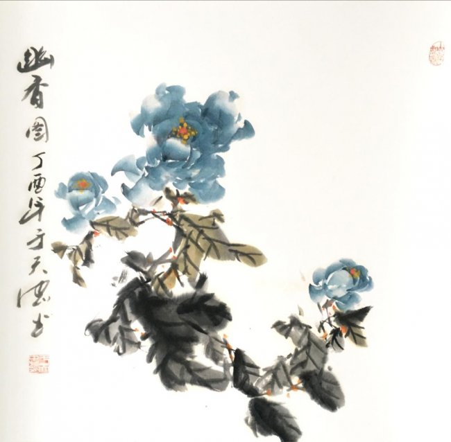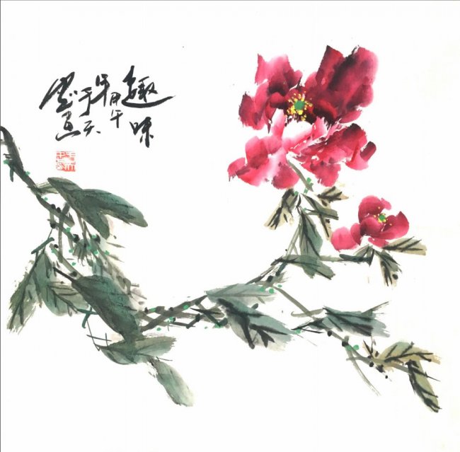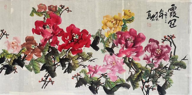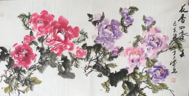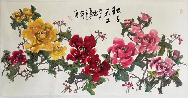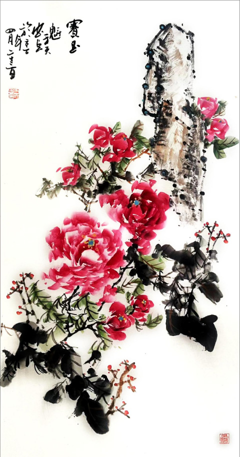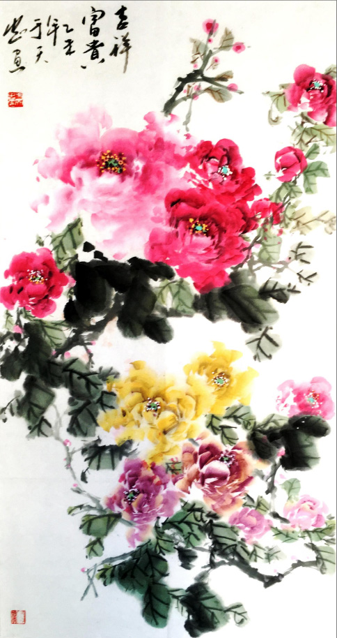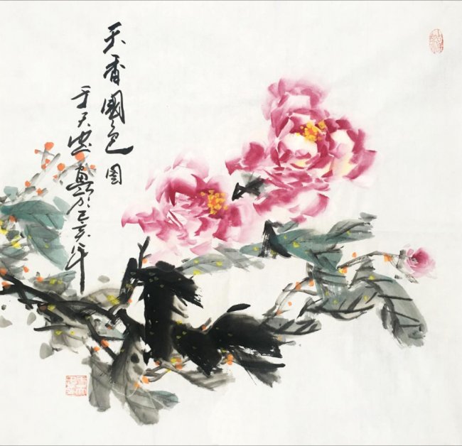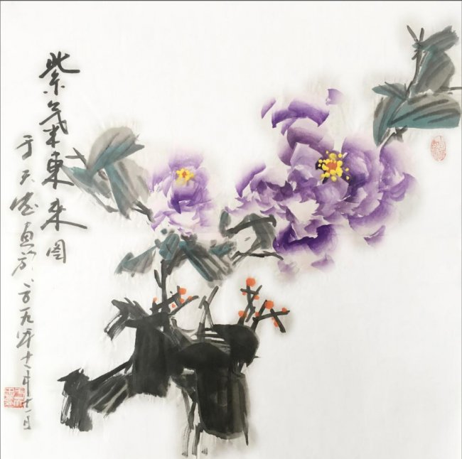 在艺术创作上,于天忠始终坚守“境由心造,象由心生”的创作理念,以文心养笔墨,以诗韵入丹青。他深谙传统书画正脉,诸体皆精,书法笔力雄健、气韵贯通,熔铸碑帖之魂,尽显正大气象;国画兼擅花鸟、山水、人物,尤以牡丹创作独步艺坛,开创“龙腾牡丹”全新画派。其笔下牡丹,拒绝俗艳的程式化表达,不贪花团锦簇的繁冗,而以三朵花头定乾坤,以枝叶蜿蜒成龙形,叶叠成龙身,枝出拟龙爪,以书法笔意入画,一笔而成,浓淡相生,既藏牡丹的雍容华贵之姿,又具龙腾云霄的昂扬气象,以龙意祛俗意,以文心立画魂,被业界誉为“将富贵气象与民族风骨融为一体的大家”,成为当代花鸟画创新的典范。他的作品兼具传统文人画的诗意内涵与鲜明的时代精神,笔墨间既有“澄怀味象”的幽远意境,又有直抒胸臆的生命张力,被范曾、孙其峰、刘大为等艺坛泰斗高度盛赞,称其为中国现代文人画的最高代表。