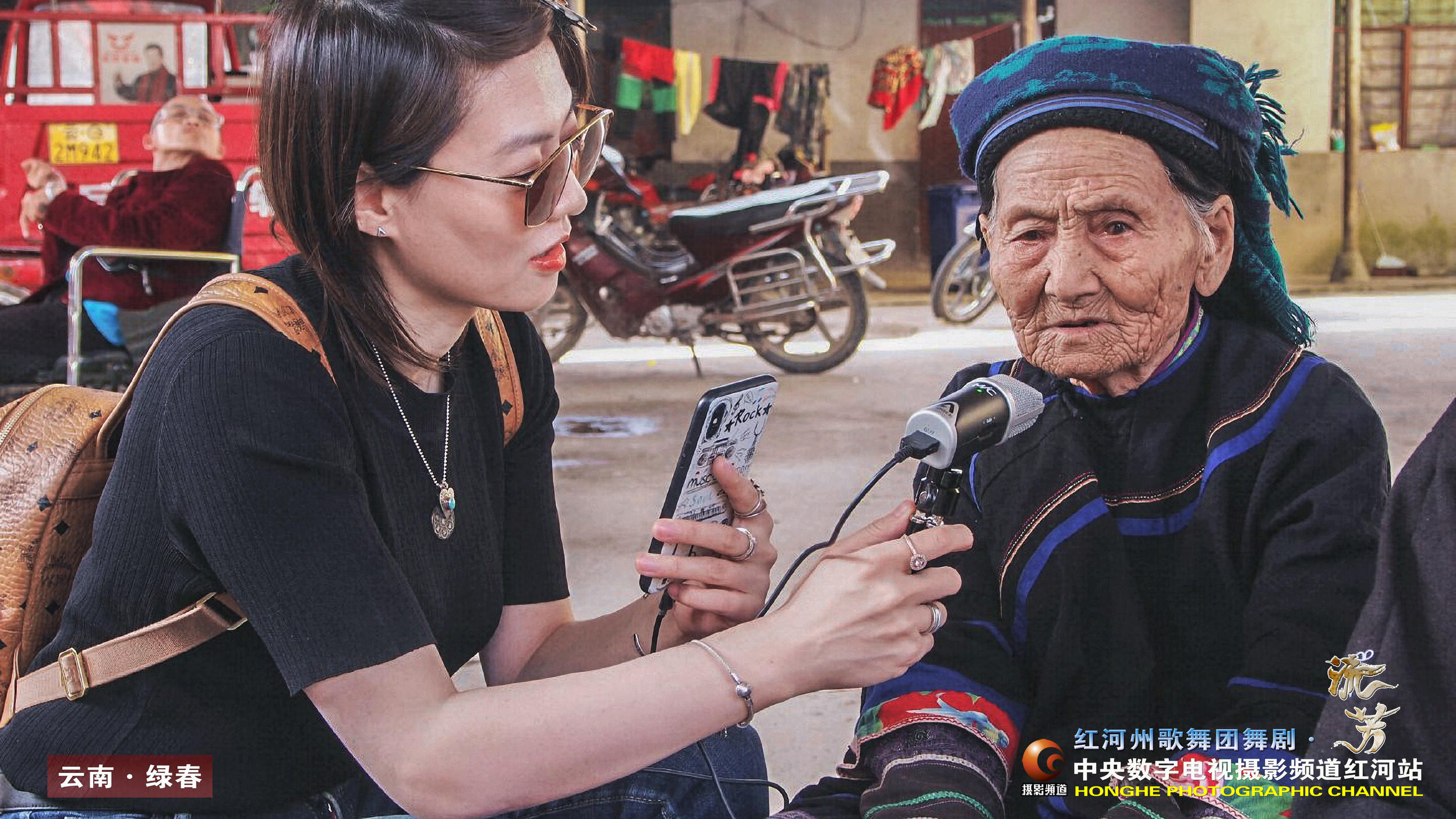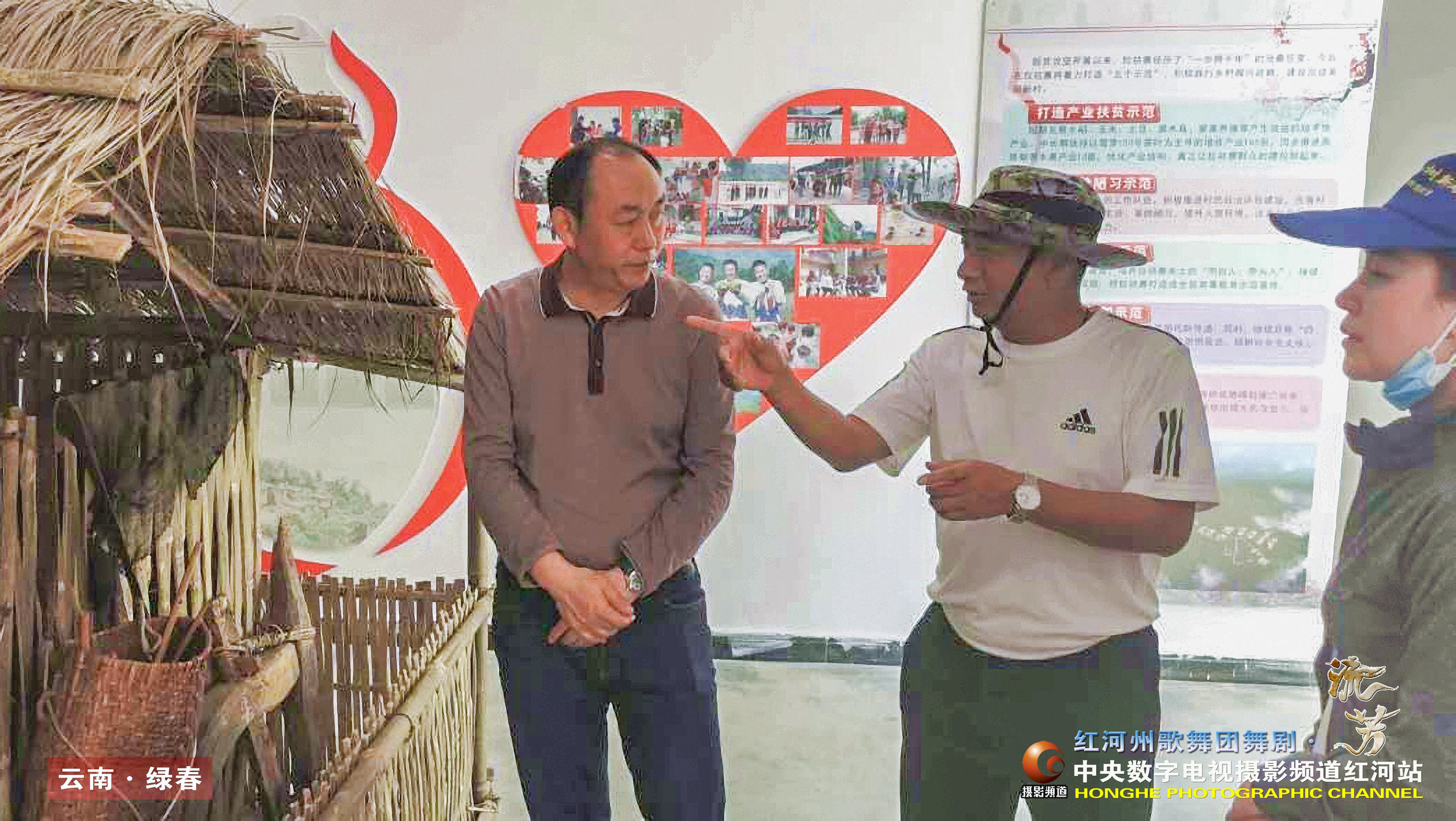 ► 图片说明:《红河州歌舞团舞剧•流芳》 剧组在苦聪人村寨进行创作采风。左为总编导张珅、右为剧中大头村的驻村第一书记刘亭亭扮演者李晓慧。(红河州歌舞团供稿)