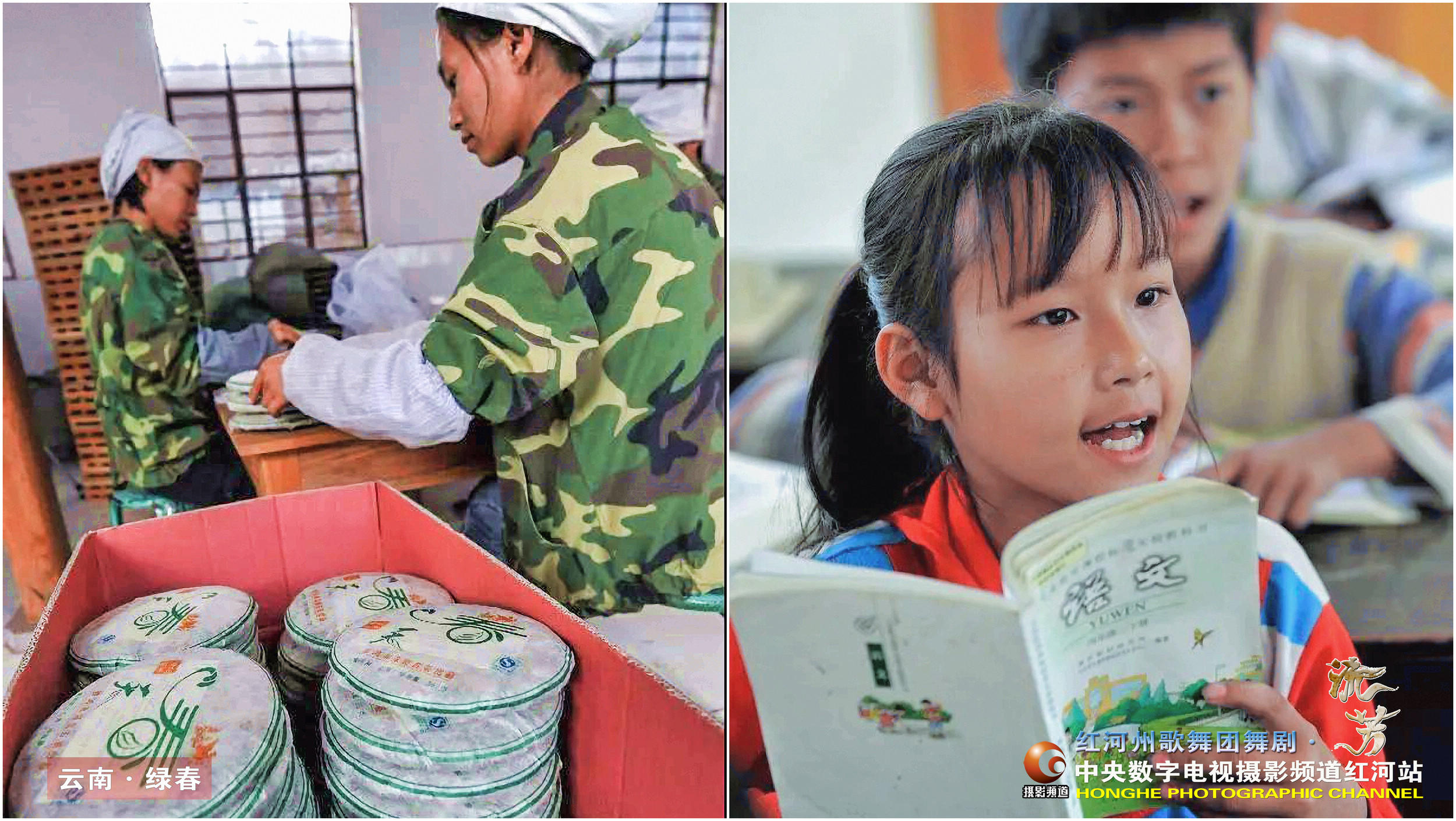 ► 图片说明:左为苦聪人发展茶叶种植和直播带货,实现整村整族脱贫致富;右为苦聪人学龄儿童实现100%入学。(网络资料)
