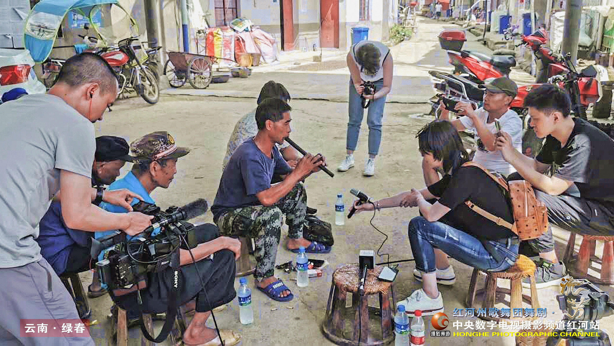 ► 图片说明:《红河州歌舞团舞剧•流芳》 剧组在苦聪人村寨采集音乐。左为亢竹青(作曲)。(红河州歌舞团供稿)