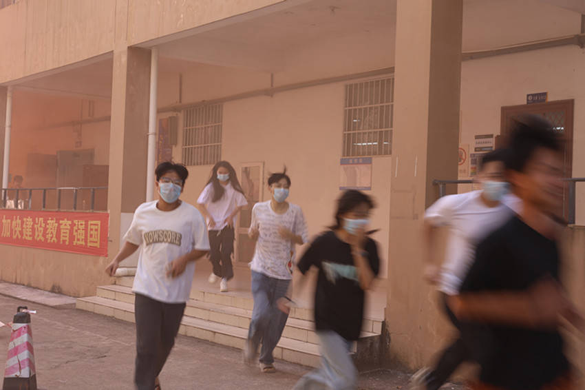 随着图书馆里急促的警报声拉响,演练正式开始。消防岗值班室收到警情后,立即启动消防应急预案,上报学校应急领导小组并拨打119报警(模拟)。各安全岗责任人迅速到位,在各楼层拐角处进行疏散和指引。老师们组织学生弯腰疾走、手捂口鼻,沿指定的疏散路线安全、快速地撤离到图书馆门口的安全地带。一名因火势过大的学生被困在五楼,消防部门抵达后立即利用云梯进行救援并组织灭火。
