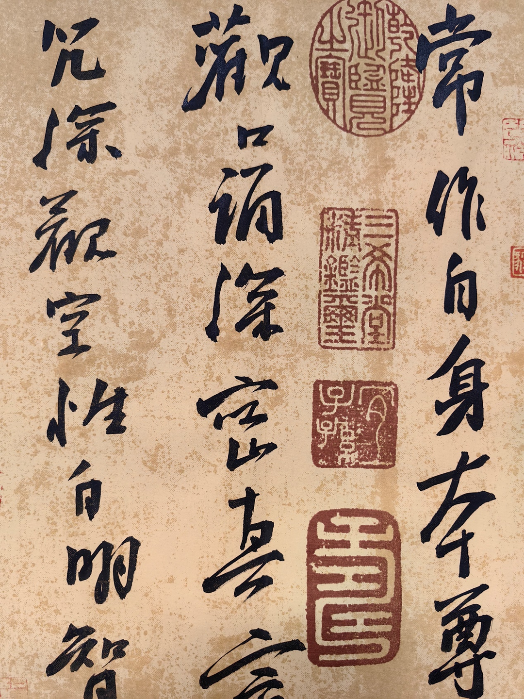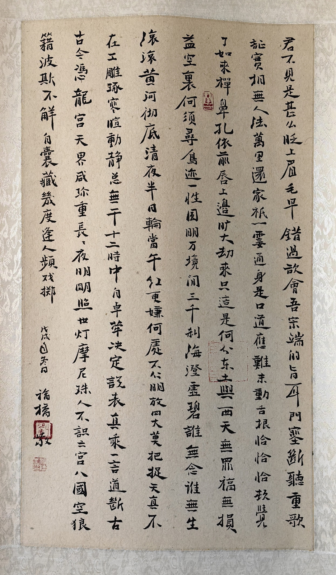 《咏竹》 猗猗修竹两三杆, 风来风去总是闲。 心空不计他人过, 节坚更有增上缘。 清蔭含窗月笼影, 玉露临溪如对禅。 君问何似般若意? 白云流水任自然。 ![]()