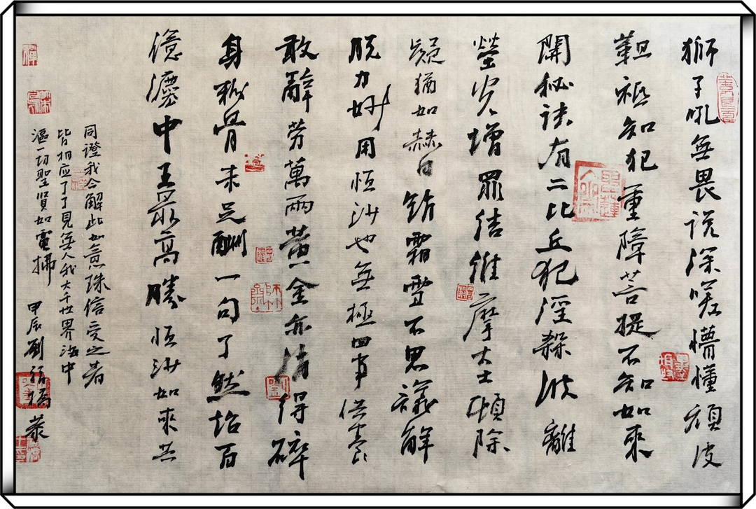 《静观》 每坐书斋如对禅, 墨香书香两悠然。 心上空华生妙有, 笔锥无由任施转。 云云本是菩提意, 得得应做如是观。 常写琅玕多清骨, 聊将是非摈耳边。 有心无心尽妙明, 一花一叶体中圆。 ![]()