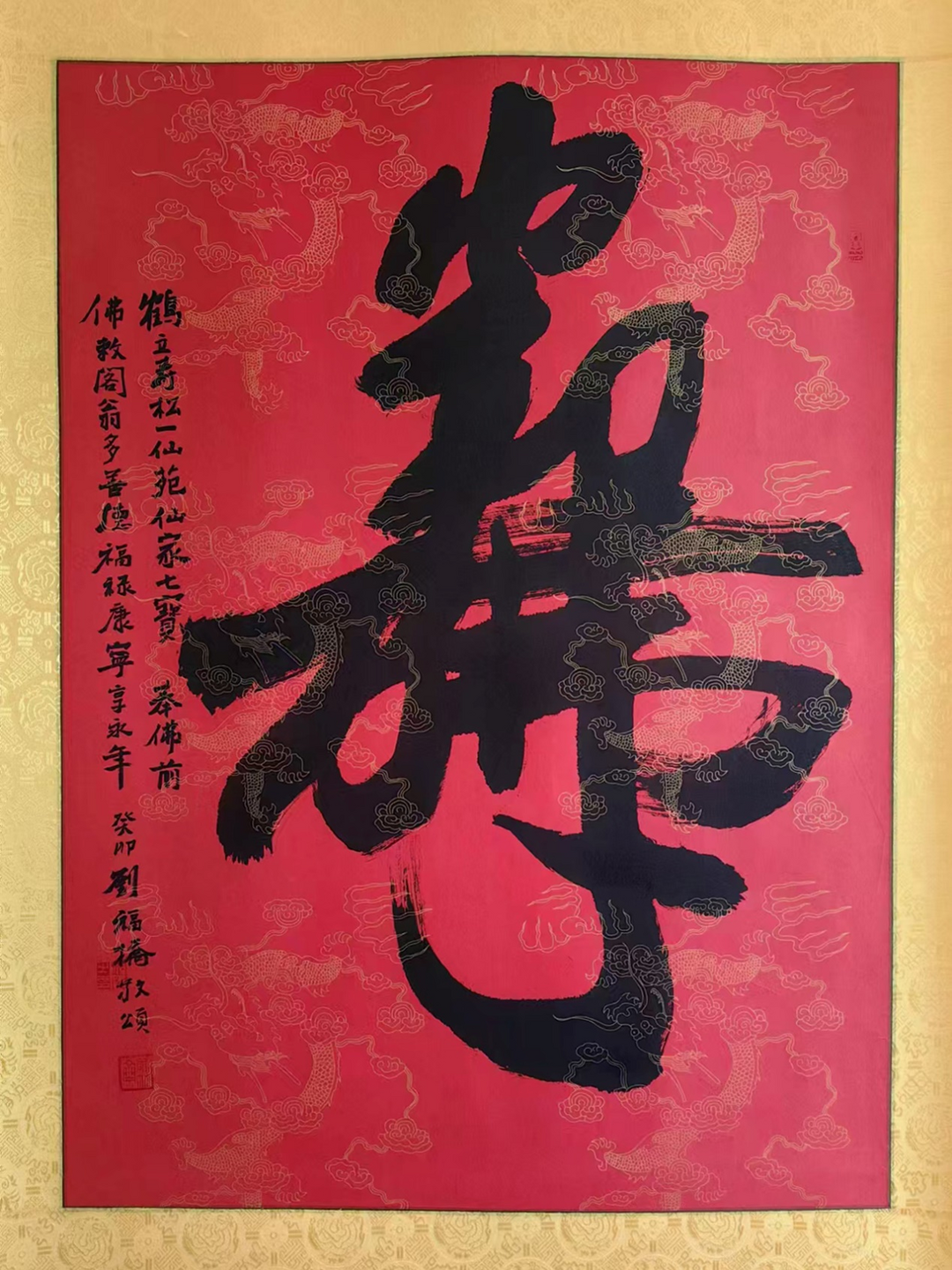 鹤立寿松一仙苑, 仙家七宝奉佛前。 佛敕阁翁多善德, 福禄康宁享永年。 为沈鹏先生九十寿诞独创此字,意寓鹤佛寿一体同春志贺 ![]()