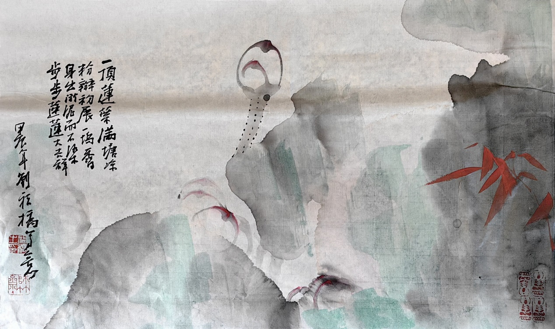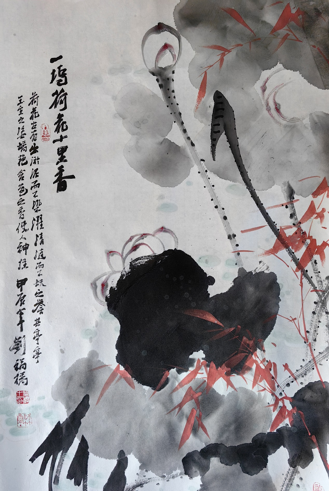 《荷花》 只因爱莲访南乡, 未见花容先闻香。 浓使碧翠倾盆洒, 纸上顿生一荷塘。 ![]()