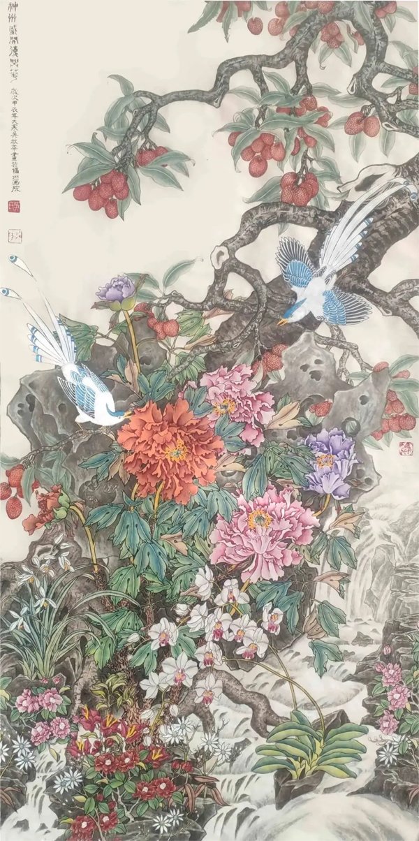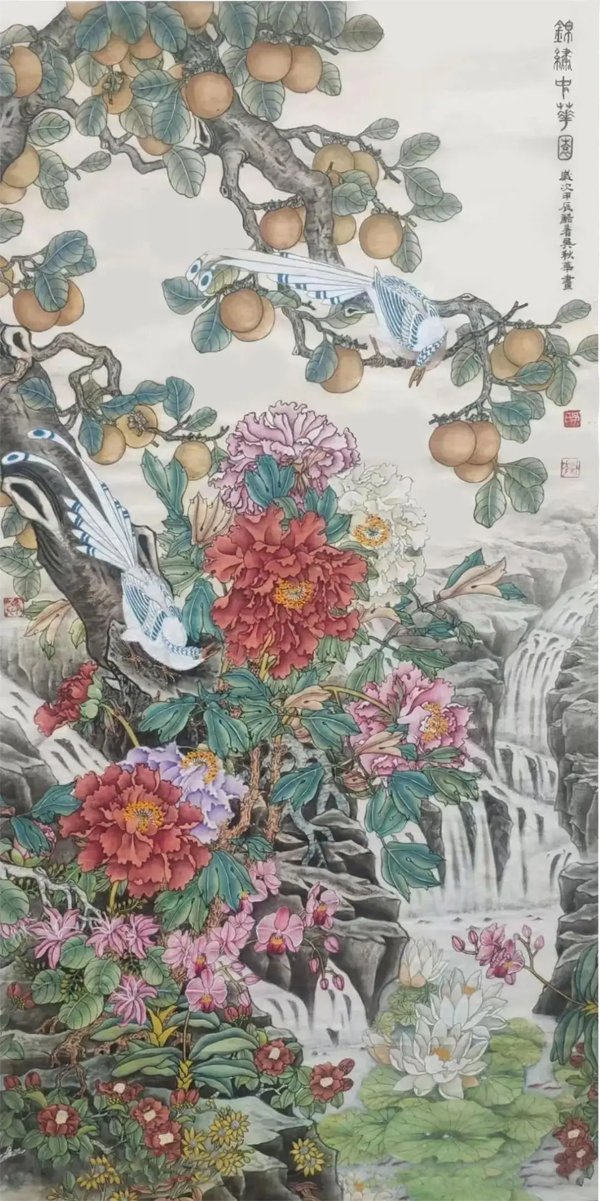 ![]() 《祖国万岁》138×66cm 2023年 个性是国画艺术的生命力 文/吴秋华 大千世界,不但动植物有个性,万物皆有个性,有个性才有生命力。艺术也一样。就中国画而言,它不仅具备造型基础、笔墨技巧这些基本功,还要在所画物象的神似上下工夫,因为中国画强调的是“神韵”追求的是“意境”,与西洋画强调的是“真”,追求的是“象”,是截然不同的两种艺术观点,所以中国画仅仅追求形似是不够的,还应该追求画面上的“神韵”和“意境”,通俗的说就是追求艺术的个性,何谓个性《现代汉语辞典》中告诉我们:个性就是在一定的社会条件和教育影响下形成的一个人的比较固定的特征。 ![]() 《神州盛开复兴花》136×68cm 2025年