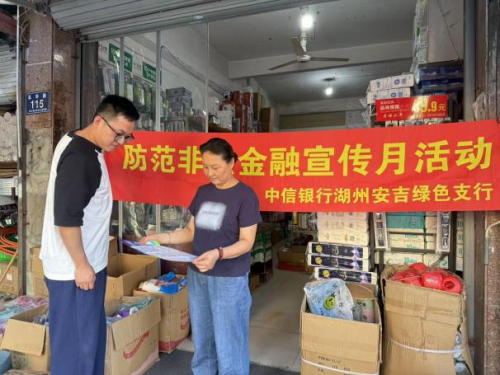 为深入贯彻落实《中国人民银行湖州市分行关于开展2025年防范非法金融活动宣传月活动的通知》相关要求,切实做好金融消费者防范非法金融宣传教育工作,中信银行湖州分行组织辖内网点开展以“守住钱袋子·护好幸福家”为主题的防范非法金融宣传月活动。 一、组织领导 加强学习 自接到通知起,我行立即组织开展2025年防范非法金融的相关活动,由分行零售部牵头,各县级支行、营业部及分行各部室进行配合,组织动员员工利用晨夕会时间学习非法金融的相关要求和注意事项,提升员工对防范非法金融的认识。 为进一步普及防范非法金融知识,我行组织全体员工积极参与中国银保传媒举办的防范非法金额活动知识答题,通过全员参与答题的形式,学习不同场景不同人群不同领域的非法金融具体表现,从而提升自身防非的识别能力,同时也积极通过微信朋友圈进行转发,扩大宣传覆盖面。 二、网点联动 集中宣传 为做好本月“守住钱袋子·护好幸福家”主题活动,我行在全辖各个营业网点在网点宣传栏内张贴主题宣传海报,在网点公众区域宣传栏摆放宣传折页方便客户领取阅读,通过电子显示屏等对客户宣传防范非法金融方面的相关知识,做到营业网点防范非法金融宣传教育全覆盖。6月15日为集中宣传日,我行安排各网点营业经理担任防非咨询员,通过向来往人群和客户发放防范非法金融宣传折页,现场接受咨询、答疑解惑,扎实开展防范非法金融普及宣传工作。