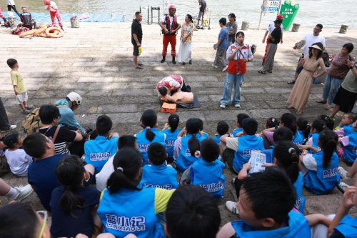 在互动体验环节,心肺复苏(CPR)实操教学与冲锋舟、救生圈等专业救援设备演示同步进行。参与者分组进行了模拟练习,通过沉浸式体验,切实学习和掌握了关键的应急救援技能。 本次活动的一大亮点是特别设置了“防溺水宣传员”聘任环节。徐媤贤等50余名学生被正式聘为“暑期防溺.海豚护航”防溺水宣传员。此举旨在鼓励学生们发挥“小宣传员”的作用,将学到的安全知识带回家庭和社区,扩大宣传覆盖面。活动期间,工作人员还向现场群众分发了防溺水宣传单及宣传册,进一步普及相关知识。