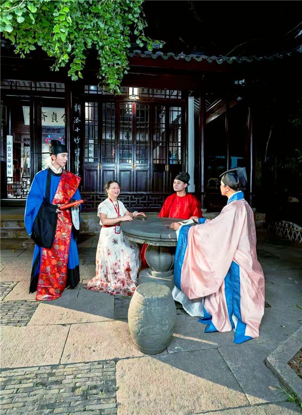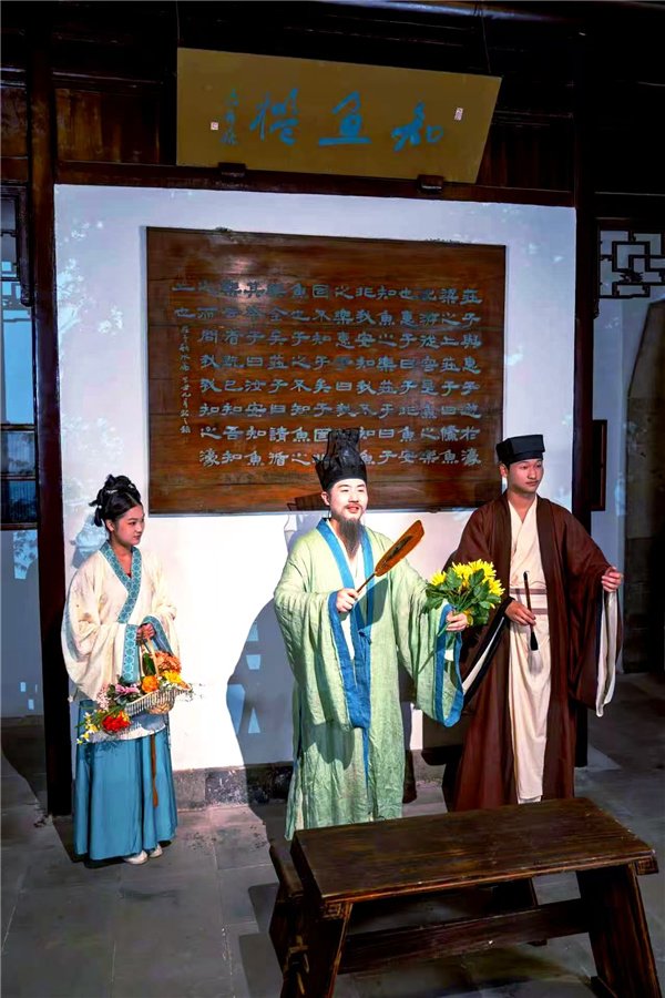 互动体验是本次活动的一大亮点。古迹区与休闲区设置多个互动点位,NPC扮演历史名人与经典影视角色,搭建起沉浸式互动场景。一方面,“寄畅有戏”文化IP持续深耕,以惠山古镇关联历史人物为线索,串联唐宋元明清文化符号,融入琴棋书画诗酒花茶等元素。
