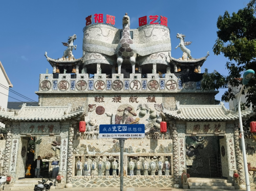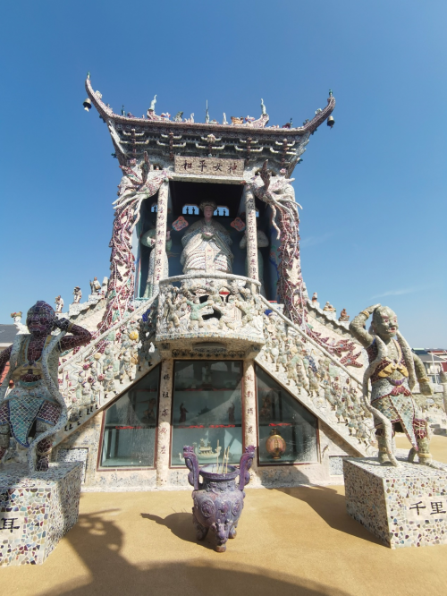 瓷艺园“妈祖宫” 走进瓷艺园,宛如踏入历史的长河。6米高的天官赐福古瓷片雕像,在阳光照耀下熠熠生辉,1600平方米的老磨盘区域,每一块磨盘都承载着岁月的痕迹,与10亿片古瓷片装饰的建筑相映成趣,展现出浓厚的历史氛围。天津建卫史、爱国教育等展示区域,通过丰富的史料和独特的瓷艺展示,生动再现了天津的发展历程与解放岁月。“赶大营”文化展示、天津记忆馆中的千件古董,凤鸟连心杯等珍贵展品,更是让游客深度领略天津的地域文化。