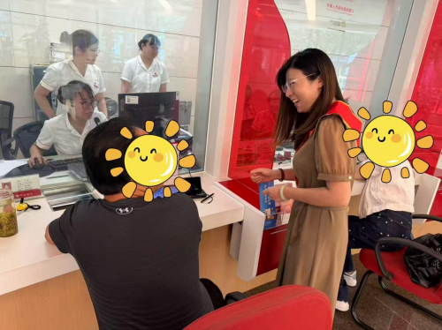 活动期间,零售分管行长身披红色绶带,主动走入厅堂,与客户亲切交流。她手持业务宣传页,耐心解答客户疑问,并贴心递上茶水,细致关怀客户需求。在柜台区域,行长结合厅堂实际业务需求,协助引导客户使用自助设备、介绍存款保险及反假币知识,并重点推广网上银行体验区等服务功能。一位办理业务的客户表示:“行长亲自服务,让人感到特别温暖,办事也更踏实!”