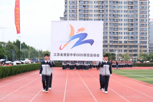 淮安区教体局副局长高云海、体育科科长张国儒,校党委书记、校长于敏,副校长成向前、马骏、葛金雷、王新南,工会主席胡鹤毅,校长助理周小艳等领导出席运动会开幕式。开幕式由学生工作处主任徐怀亮主持。 上午7时,伴随着激昂的《运动员进行曲》,开幕式入场式正式开始。国旗方阵、校旗方阵、会徽方阵、彩旗方阵、鲜花方阵、气球方阵、各级部代表队方阵、教师运动员方阵、裁判员方阵依次入场。各方阵步伐整齐、口号嘹亮,展现出淮中师生昂扬向上的精神风貌。各级部的创意表演精彩纷呈,成为运动场上一道亮丽的风景线。 入场式后,举行了庄严的升旗仪式。五星红旗在国歌声中冉冉升起,全场师生肃立行注目礼,齐声高唱国歌。