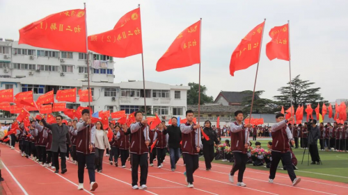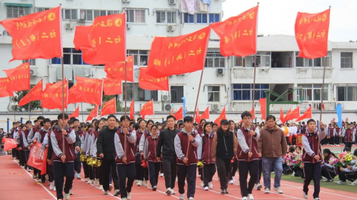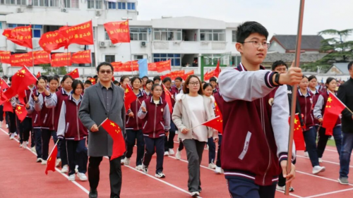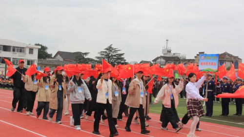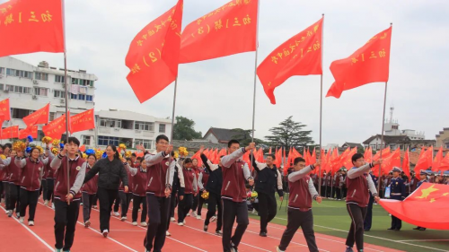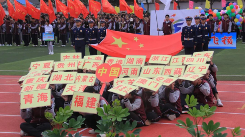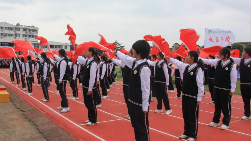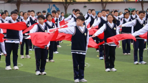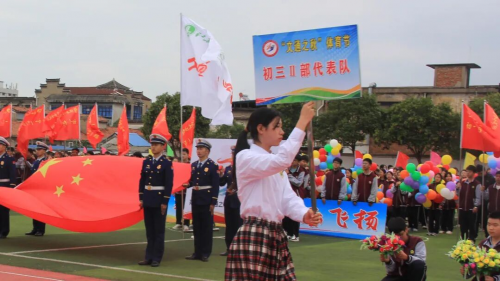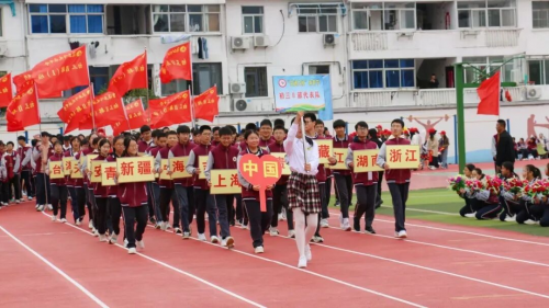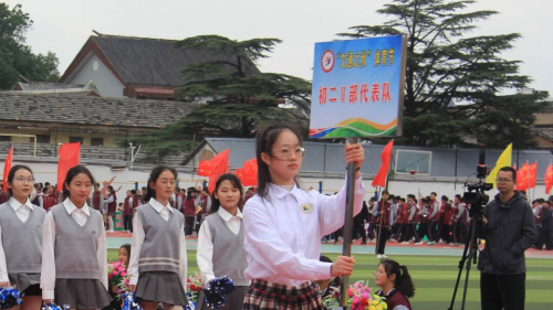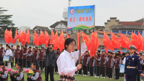 伴随着庄严旋律,升旗仪式正式开启。全场师生肃立,目光紧随冉冉升起的国旗,嘹亮国歌回荡校园,每一道注目礼里,都饱含着对祖国的深切敬意。 方阵入场 展文通风采 少年鲜衣怒马,青春不负韶华。校园内彩旗猎猎、人声鼎沸,激昂的《运动员进行曲》一经响起,国旗方队、校旗方队、会旗方队、花束方队、彩旗方队便依次迈着整齐步伐入场。他们精神抖擞、意气风发地走过主席台,缤纷旗帜迎风招展,鲜艳花束传递活力,铿锵步伐踏响信念,豪迈誓言激荡人心,尽显文通人奋发向上的精神底色。