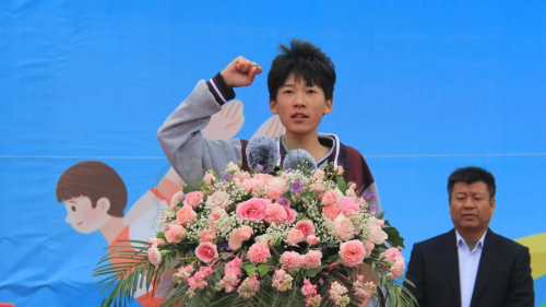 运动员代表初一Ⅰ部(1)班连宇阳同学代表全体运动员宣誓,表态将恪守“友谊第一,比赛第二”准则,尊重对手、尊重裁判、遵守规则,全力以赴赛出最佳水平。