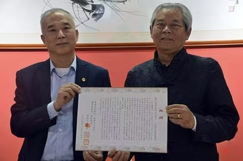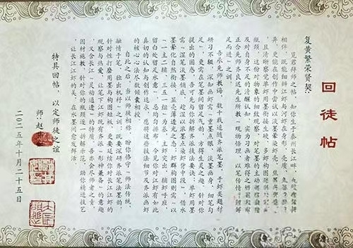 仪式现场,黄繁荣依传统礼仪向赵井如先生行拜师礼,依次敬茶、敬酒,并郑重递交拜师贴,以赤诚之心表达求学之志。赵井如先生欣然受礼,随后递交回师贴,完成了意义深远的传承仪式。面对弟子的敬意,赵井如先生郑重承诺:“将以匠心传艺,不吝赐教,把齐派艺术的精髓倾囊相授,毫无保留。”黄繁荣则回应道:“定当以空杯之心潜心求学,努力吃透齐派艺术精髓,不负师父所望与师门重托,全力将齐派艺术代代相传。” ![]()