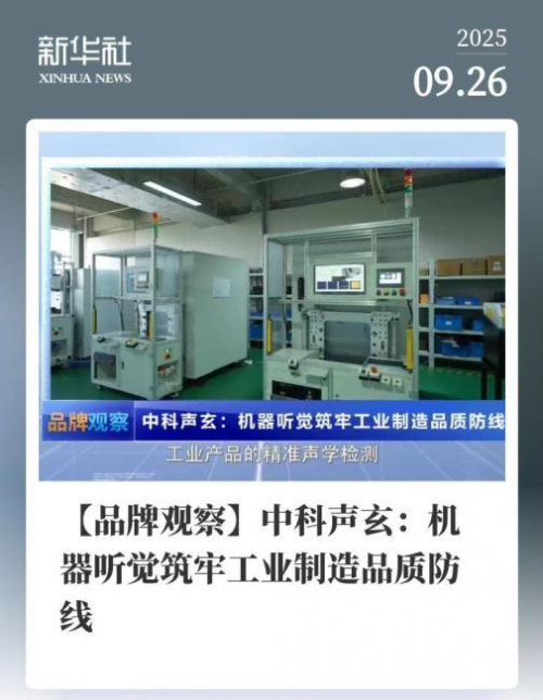 新华社客户端报道中科声玄海报图 新华社报道指出,在工业制造迈向高端化、智能化的今天,产品的精准声学检测与智能诊断已成为保障品质的关键环节。传统人工检测受限于主观经验与效率瓶颈,难以满足现代制造业对高精度、高一致性的严苛要求。 中科声玄通过构建包含噪声、振动与异音测试系统的完整解决方案,实现了对工业产品声振信号的量化分析与异音智能识别,推动工业质检从“经验驱动”向“数据驱动”的根本性转变。报道强调,该技术具备非接触、实时性强、可穿透结构表层的独特优势,能够精准反映设备磨损、装配精度、材料性能等多维信息,为汽车、3C电子、家电、医疗等领域提供了创新性的品质管控支撑。