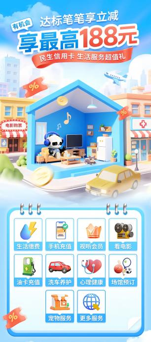 银行与互联网平台的深度合作,不仅将“省钱”的消费体验具象化到每一笔订单中,让用户真切感受到便利和实惠,更在消费金融与数字经济融合的过程中,释放出更强的市场活力,进一步提升了金融服务的便利性。 更值得一提的是,民生信用卡中心的“便民”生活圈建设延伸至全国多地,涵盖餐饮饮品、商超便利、生活服务等众多商家,为客户提供便利的品质生活服务,在北京、上海、广州、深圳、成都、杭州、西安、太原、厦门等近40个城市的多个生态圈内,持卡人在指定商户通过微信支付时,选择绑定的民生借记卡或信用卡结算,即可享受满减优惠或0.1-88元随机立减福利。 这种“银行送优惠、支付给便利、商圈供场景”的生态闭环,让金融服务穿透到消费的毛细血管,既贴合了百姓的生活需求,也为扩大内需注入动力。 点燃消费热情,赋能美好生活 消费在经济增长中的基础性作用日益突出。国家统计局最新数据显示,2025年前三季度,最终消费支出对经济增长贡献率为53.5%。 今年,国务院办公厅印发《关于进一步释放消费潜力促进消费持续恢复的意见》指出,消费是最终需求,是畅通国内大循环的关键环节和重要引擎,对经济具有持久拉动力,事关保障和改善民生。商务部等9部门也发布《关于扩大服务消费的若干政策措施》,提出五方面19条举措进一步扩大服务消费。 在政策指引下,金融机构也在积极做好科技金融、绿色金融、普惠金融、养老金融、数字金融“五篇大文章”,提高金融服务便利性和竞争力,惠及民生。 其中,民生信用卡中心积极响应,依托数字化平台创新,推出多场景消费激励活动。一方面,通过与京东、支付宝、抖音等头部电商平台深度合作,拓展“金融+生活”生态圈,双方在支付场景、产品功能、物流等方面实现优势互补,满足消费者多层次消费需求的同时,体现了金融服务的广度和温度。 另一方面,不断加大对普惠金融的探索与实践,通过“全民管家”入口,将优惠延伸至居民日常生活服务领域,用户在全民管家进行生活缴费、手机充值、油卡充值、洗车养护、电影购票等多项生活服务,可享受优惠。