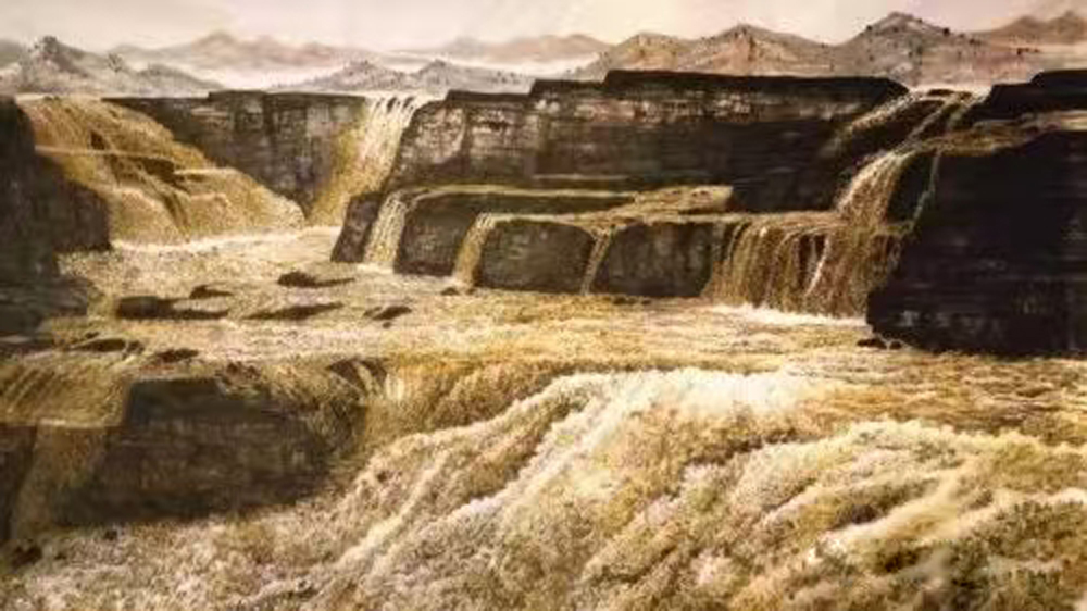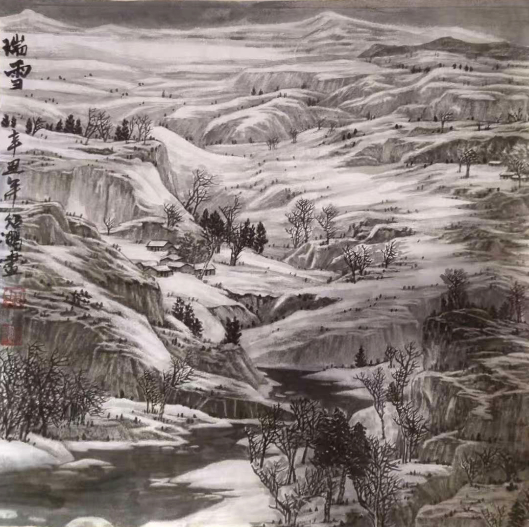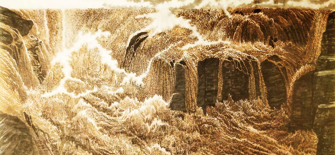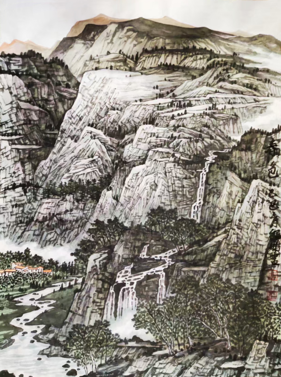 胡绍鹏的画作,以写实为基,以气韵为魂,兼具雄健风骨与人文温度。他笔下的山水,层峦叠嶂见纵深,云海流瀑藏灵秀,《巍巍长城》的雄浑壮阔、《霞光照山川》的明丽澄澈,皆以独特的笔墨结构营造出强烈的立体感与哲思意味,正如梁树年先生所言,“画出了大自然的永恒”。而《过年》《住在黄河边》等作品,则将视角投向生活本真,以细腻笔触勾勒民俗风情与人间烟火,让作品散发着浓郁的生活气息,直抵观者内心。在技法上,他大胆融合中西,将西画的光影处理融入水墨的笔墨意趣,既保留中国画的意境神韵,又赋予作品全新的视觉张力,黎雄才先生盛赞其“深沉坚实雄浑,既有中国画的意境,又有独特艺术语言”。 ![]() 《滔滔巨浪》90×120cm 2025年
