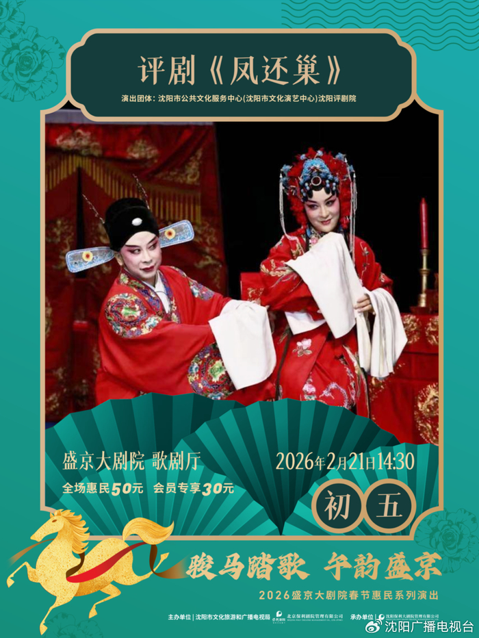 “沈阳相声大会”这一艺术品牌创立于1949年,沈阳曲艺团于2023年11月对该品牌进行了重启,并推出了多样化的演出形式。其中包括一年一度的“沈阳相声大会”大剧院专场、每月常态化的的小剧场演出以及艺术惠民活动等。沈阳曲艺团曾培养出众多在全国具有影响力的相声演员,如杨振华、金炳昶、王志涛、范伟、巩汉林等,他们代表的“沈阳相声”更是名扬全国。如今,新一代沈阳曲艺团将这块金字招牌重新擦亮,使沈阳相声再次走进观众的视野。 2026年春节期间,沈阳相声大会特别推出了春节专场!欢度团圆年,不容错过的“沈阳相声大会”,为您和家人带来一整年的欢笑! 07 评剧《凤还巢》 大年初五
