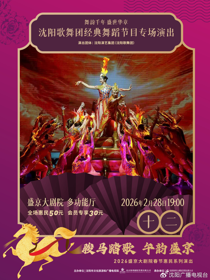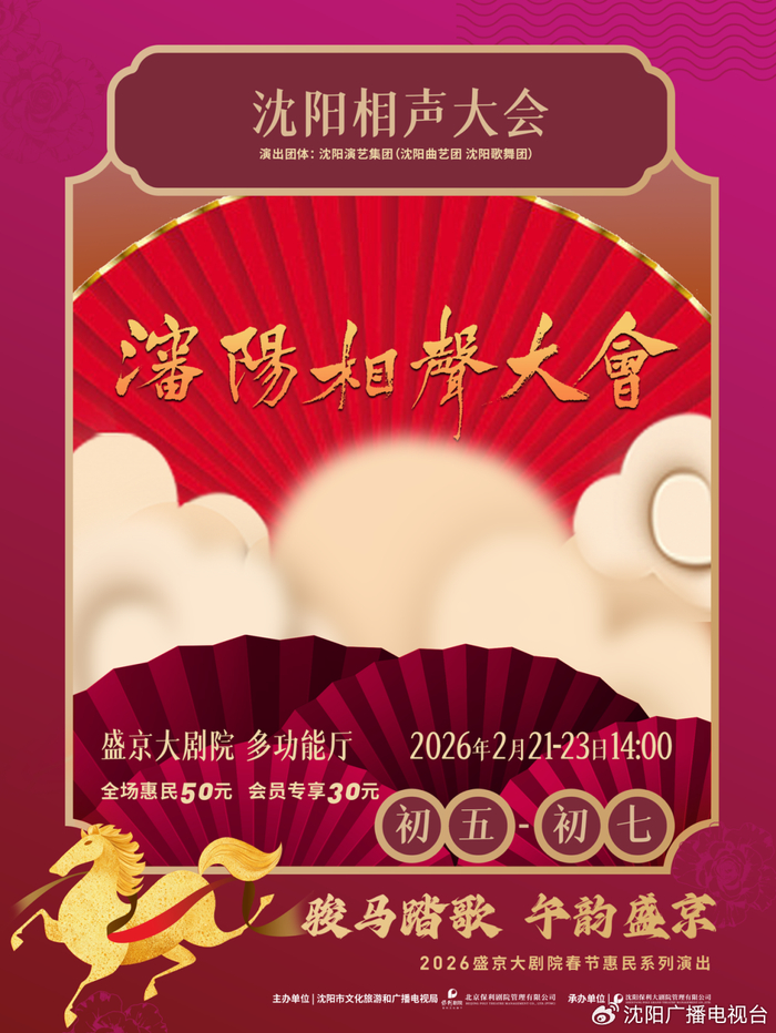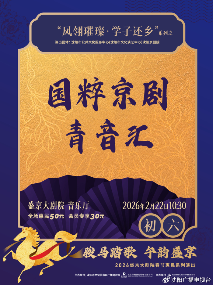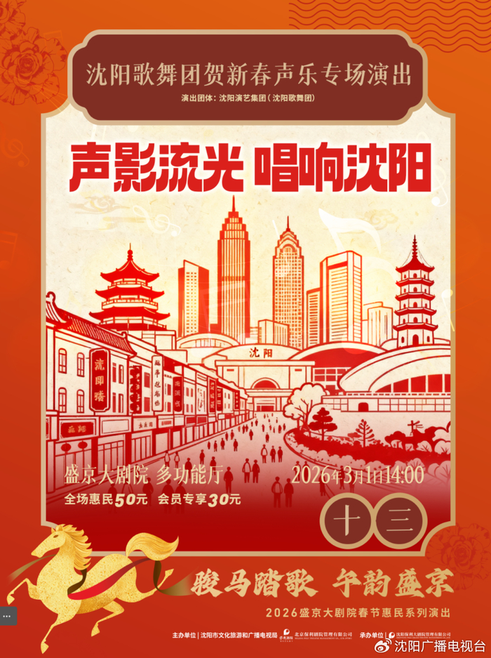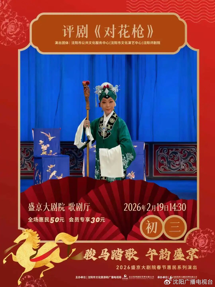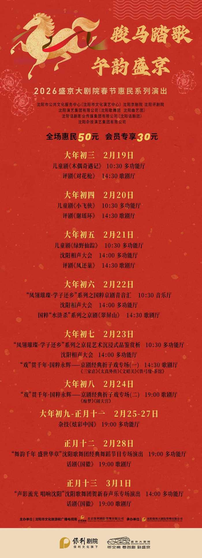 “过大年,看大戏!”一直是中国老百姓迎接农历新年的“老规矩”。每到春节,沈阳保利大剧院管理有限公司都会为沈城观众准备多场精彩演出,市民朋友和外地游客新春佳节的文化消费需求。那么2026马年新春佳节期间,盛京大剧院准备了哪些新春惊喜呢? 2026年近在咫尺 “骏马踏歌 午韵盛京” 21台精彩纷呈的剧目轮番上演 京剧、评剧、儿童剧、 歌舞、话剧、曲艺、杂技、青音汇...... 无论是大朋友还是小朋友 都能找到属于自己的年味! 让我们热热闹闹来看戏 锣鼓喧天喜迎春吧! 全场 统一票价 50 元 会员专享 30 元 超低的全场惠民票价,即将开票! 提前预约您专属的“剧院年饭” 春节期间 全家一起看大戏的习俗 一点点的被找回来了 12月5日(本周五) 即将开票 2026 新春好剧一览