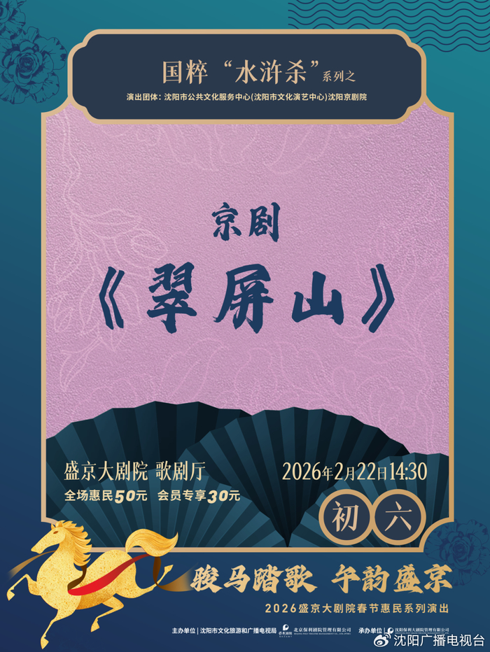 演出时间 2026年2月22日 大年初六 10:30 演出地点 盛京大剧院 音乐厅 当盛京的年味邂逅皮黄的雅韵,这场承载文旅情怀与传承使命的演出,以“凤翎璀璨·学子还乡”为题,解锁传统文化年轻化表达的新范式。 “青音汇”一语双关,既是青春之声的聚力绽放,亦是青年知音的倾心相聚。卸下戏台上的甲胄妆容,沈阳京剧院青年骨干、赴外求学的戏曲骄子与校园崭露头角的潜力新秀,以本真姿态唱响经典唱段。他们是沈阳戏曲沃土培育的栋梁,或已成剧团中坚,或在求学路上精进,虽步履各异,却因对家乡的眷恋与对国粹的热爱,齐聚盛京舞台,让青春底气与传统底蕴撞个满怀。 这不仅是一场演出,更是沈阳文旅“筑巢引凤”的生动实践——城市搭台,让本土人才尽展风采;国粹为媒,向全国英才抛出橄榄枝。近年来,沈阳京剧院始终以“传统艺术时尚化、戏迷群体年轻化”为追求,此次学子还乡演出,既彰显后备人才的蓬勃力量,更让京剧艺术在乡音乡情中焕发新生。当水磨调与皮黄韵在盛京回响,传统与青春共振,文化与旅游相融,这场新春之约,邀你共赴知音之会,见证国粹在新时代的盛京风华! 9 “国粹“水浒杀”系列之 京剧《翠屏山》 大年初六