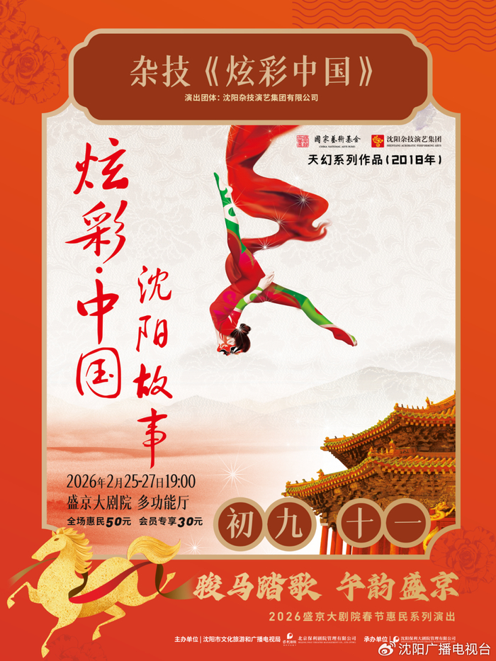 演出时间 2026年2月24日 大年初八 19:00 演出地点 盛京大剧院 歌剧厅 《痴梦》主演: 中央广播电视总台首届青年演员大会“潜力新人” 娄伊敬 《闹天宫》主演: 梅花奖、华鼎奖、中国艺术节优秀表演奖得主 一级演员 常东 13 杂技《炫彩中国》 大年初九——正月十一