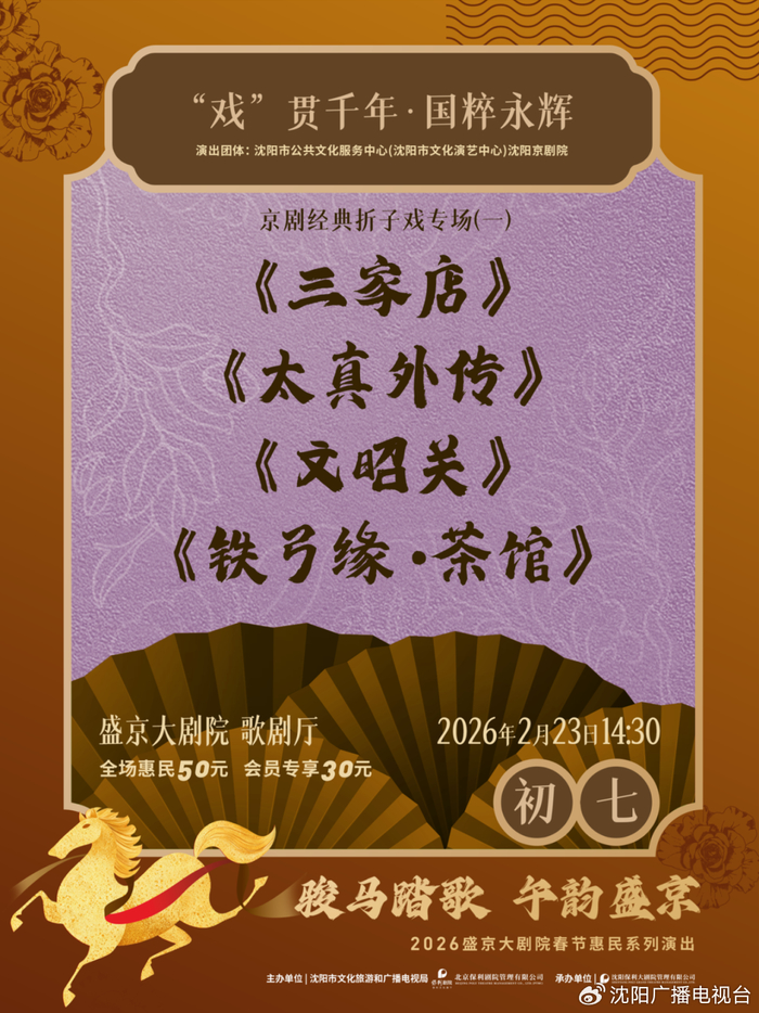 演出时间 2026年2月23日 大年初七 14:30 演出地点 盛京大剧院 歌剧厅 《三家店》主演: 京剧杨(宝森)派艺术隔代传人 周坚 《太真外传》主演: 京剧梅(兰芳)派艺术隔代传人 二级演员 刘畅 《文昭关》主演: 京剧杨(宝森)派艺术隔代传人 一级演员 宋伟东 《铁弓缘·茶馆》主演: 全国戏曲表演领军人才 一级演员 陈阳 这场以“百花齐放续华章”为核心亮点的演出,既是院团老中青年实力派阵容的集体亮相,更是沈阳文旅展现文化兼容并蓄的生动实践,邀您共品国粹新声的舞台回响。 本场演出以“戏贯千年”为脉络,精选不同历史时期的经典京剧片段,皆以京剧的程式美学娓娓道来。沈阳京剧院名家新秀将纷纷登台:既有舞台经验深厚、深谙流派精髓的艺术骨干,以沉稳台风诠释经典;亦有活力十足、屡获行业认可的青年才俊,以时代性的表达焕活传统。不同行当、不同流派的艺术特色在此交融——或见青衣的婉转柔情,或赏武生的英武豪情,或品老生的苍劲醇厚,或观花脸的刚正豪迈,于方寸舞台间呈现“百花齐放”的艺术盛景,尽显院团传承多年的艺术积淀与兼容并蓄的格局。 作为沈阳新春文旅的重要文化名片,这场演出既是院团向家乡观众的新春致敬,更是推动传统艺术融入城市文旅发展的具体实践。它让市民与游客在剧场中触摸历史人文的温度,感受国粹艺术的永恒魅力,为盛京新春增添浓厚的文化底蕴。这个新年,盛京大剧院歌剧厅,与沈阳京剧院一道,在“戏贯千年”的演绎中,赴一场跨越时空的国粹之约,见证传统艺术与城市文旅的双向赋能! 12 “戏”贯千年·国粹永辉 --京剧经典折子戏专场(二) 大年初八