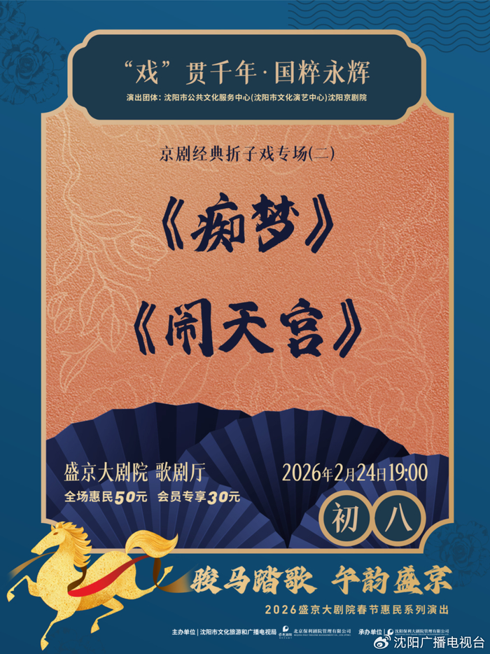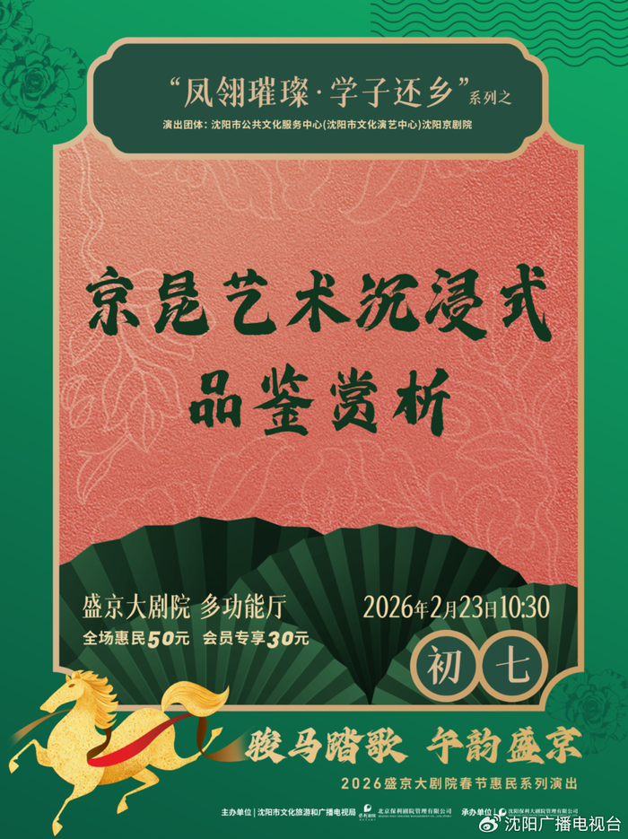 演出时间 2026年2月23日 大年初七 10:30 演出地点 盛京大剧院 多功能厅 本场演出以沈阳京剧院与北方昆曲剧院签订的全国首例京昆跨地域战略共建协议为根基,是双方联动下,青年人才研学昆曲艺术、践行“以昆养京”理念的阶段性成果展示,在新春盛京的暖意中,解锁传统艺术跨界传承的新图景。 沈阳京剧院深耕人才培育,以战略共建为纽带,不仅院内涌现诸多优秀青年才俊,更联动共建院校的在读后学,汇聚在外深造的才彦隽秀,构建“本土培育+外部赋能”的人才发展格局。此次登台的青年演员与学子,虽处不同成长阶段,却因乡情与艺术热爱齐聚——他们以扎实功底演绎精选昆调雅韵及京昆同源经典剧目片段,借昆曲细腻身法与声腔韵律,夯实京剧表演根基,生动诠释“以昆养京”的传承智慧,亦是战略共建在梯队人才培养上的标志性实践。 这场沉浸式品鉴,既是沈阳青年戏曲人研学成果的集中亮相,也是沈阳文旅搭建跨地域艺术交流平台的生动注脚。既助力本土青年人才在跨界实践中成长,更以“学子还乡”的温情,向全国戏曲人才传递“筑巢引凤”诚意,为文旅融合注入深厚文化底蕴。诚邀共赴这场连接乡情、跨越剧种的新春雅集,品味传统与青春碰撞的独特魅力! 11 “戏”贯千年·国粹永辉 --京剧经典折子戏专场(一) 大年初七