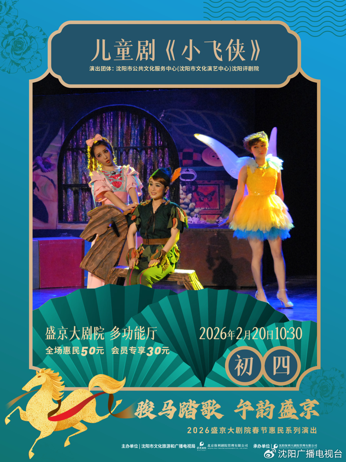 演出时间 2026年2月19日 大年初三 14:30 演出地点 盛京大剧院 歌剧厅 隋朝罗艺赶考途中,病倒在姜家集,被姜桂枝父亲救起,与姜桂枝成婚,并向桂枝学得祖传枪法,后离家科考,音讯杳然。四十年后,姜桂枝闻听罗艺在瓦岗案聚义,带领儿孙前往寻夫。不想罗艺已另娶秦氏,并生子罗成,听说桂枝来寻,翻脸不认,反诬桂枝是奸细,命诸将出战。姜家儿孙武艺高强,诸将不敌,罗艺亲往迎战,反被桂枝打败。程咬金得知内情,从中调解,迎桂枝上山,夫妻父子团圆。 03 儿童剧《小飞侠》 大年初四