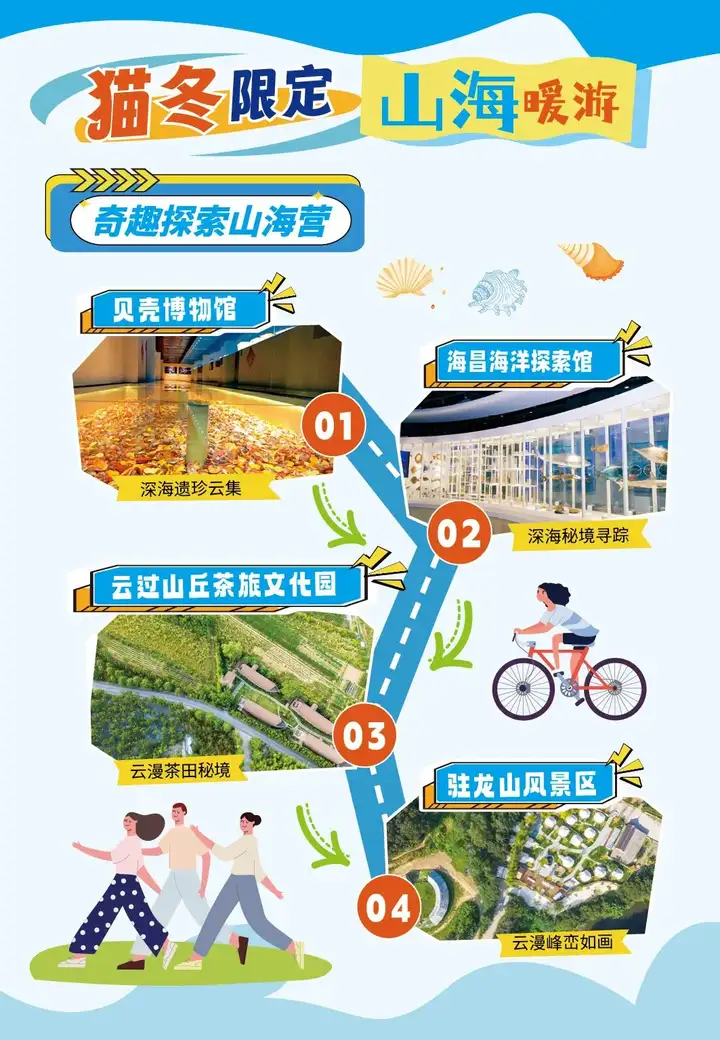 谁说冬天的海边不好玩?冬日的山海天是藏着“金色朝阳映黄海”“星空与海浪共鸣”的浪漫秘境!为了将这份冬日浪漫具象化,山海天文旅局精心策划推出五大主题旅游线路,以暖阳、海浪、星空与闲情为笔,绘制出一幅独属于山海天的冬游画卷。 五条主题线路各有风情,而那些专属特色产品,更是让这场冬日之旅亮点加倍!从浪漫写真到康养套餐,从雨林露营到非遗体验,每一款都精准戳中你的期待~ 浪漫与治愈双向奔赴 黄海潮汐·星岛暖冬漫游 ![]() “怦然心动”冬季限定 写真活动 ![]() 谁能拒绝在山海间定格专属冬日记忆呢?情侣套系777元解锁ins风打卡点,牵手踏浪、依偎看海的甜蜜瞬间,有粉色朝霞与金色落日当天然滤镜;个人写真299元就能以36公里黄金海岸为幕,成为山海间最亮眼的主角,让爱意与美好被永久珍藏。 活动地点:阳光海岸花屿海 活动时间:2025.12.1-2026.1.31 联系电话:17663361555 交通指引:自驾导航山海天阳光海岸3号停车场;公交车可乘坐10路、33路、36路、42路、K1路、游1路至【月海花园站】下车。 冬日海光计划 星岛鸥遇季 ![]() 来星岛与海鸥赴一场冬日之约!海洋美学酒店、海物语酒店前台免费领喂食包+“海鸥来信”打卡卡片,小红书/抖音发布打卡内容还能兑换明信片。12月30日前订房享9折、用餐9.5折,“日照济州岛”的浪漫,藏在鸥鸣与蓝海之间。 活动地点:星岛蓝碳计划 活动时间:2025.10.21-2026.1.31 联系电话:0633-8280888 交通指引:自驾导航山海天星岛蓝碳计划;公交车可乘坐游1路、36路公交车至【山海天游客服务中心站】下车。 森系趣玩省钱计划 ![]() 日照海滨国家森林公园福利大放送!29.9元坐森林小火车,19.9元与麋鹿亲密互动,摩天轮成人票仅24.9元(检修后开放);木育森林平日票低至56元,计次卡更划算,全家老小都能沉浸式解锁森活木趣。 活动地点:日照海滨国家森林公园 活动时间:2025.12.1-2026.4.30 联系电话:0633-3680998 交通指引:自驾导航日海滨国家森林公园;公交车可乘坐36路、游1路至【森林公园站】下车,35路、56路至【森林公园西门】下车。 暖冬海岸慢享 阳光海岸露营公园承包你的冬日温暖!元旦“3天2晚跨年迎日出”套餐8折优惠,星空篝火+户外大屏氛围感拉满;平日3天2晚套餐7折,暖冬露营火锅暖心上线,听着海浪围炉畅谈,这才是跨年的正确打开方式~ 活动地点:阳光海岸露营公园 活动时间:2025.12.1-2026.1.30 联系电话:0633-8666116 交通指引:自驾导航阳光海岸露营公园;公交车可乘坐游1路、36路至【陈家村站】下车。 烟火与潮流碰出惊喜 渔港寻鲜·雨林潮玩体验 ![]()
