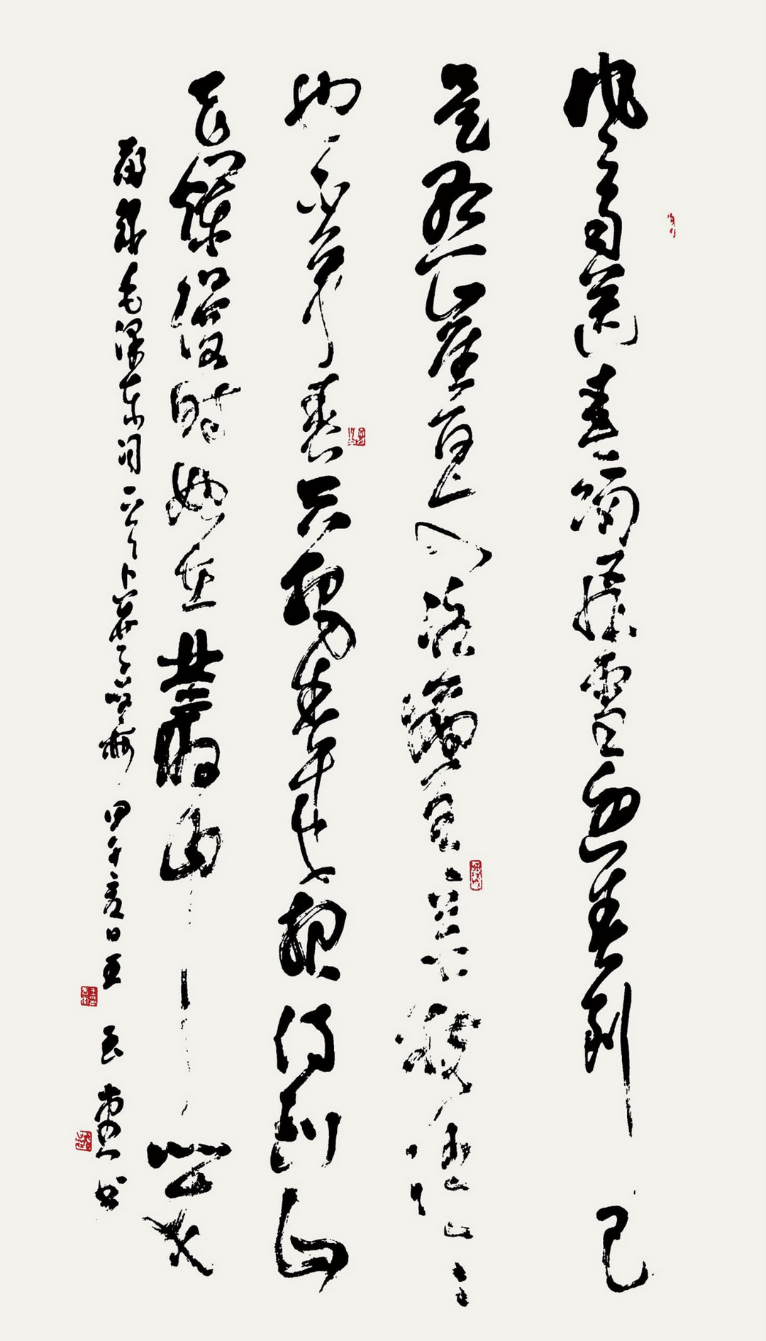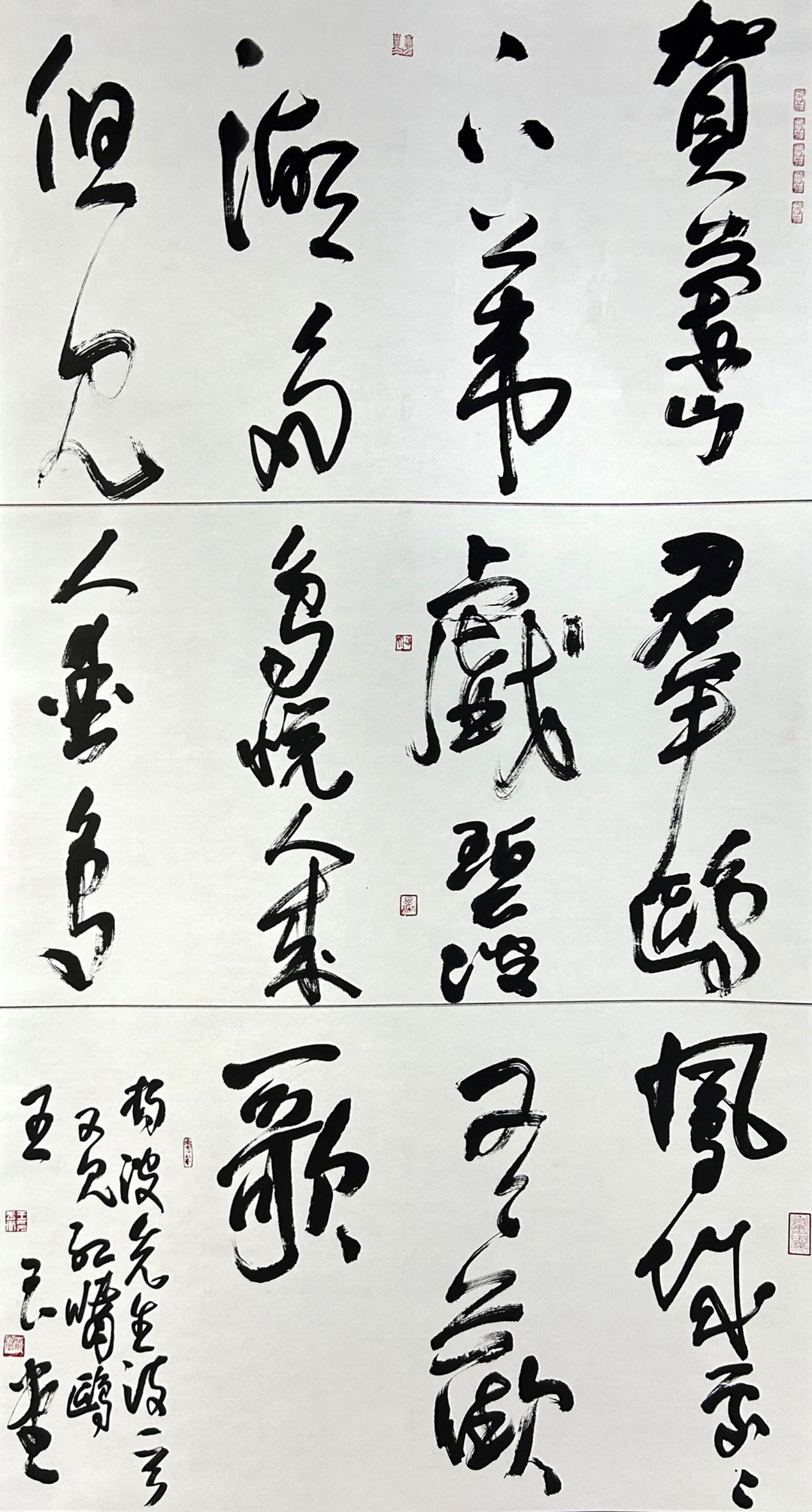 而行草则展现出他对“帖学”的深刻领悟。行草贵在意气连贯,先生的行草作品如行云流水,笔势往来顾盼呼应,却无一丝轻率之感。他借鉴王羲之《兰亭序》的灵动、米芾“刷字”的爽利,更融入怀素草书的豪放,形成“刚柔相济”的个人风格。单字看,笔画牵丝映带自然,提按转折精准;通篇观,行气贯通如江河奔涌,字与字、行与行之间疏密有致,留白处似有“气”的流动。尤为难得的是,他的行草虽显洒脱,却始终“放而不纵”——即便笔势最奔放处,也能以细微的顿挫收束力道,避免了狂草易犯的“野怪”之病。 ![]() 《清平乐·六盘山》139cm×34cm×4 2018年 从隶书的沉稳到行草的灵动,王玉堂先生实现了“碑”与“帖”的有机融合。这种融合并非简单的技法叠加,而是将隶书的“骨”与行草的“气”化为已用:写隶书时,以行草的笔势增强线条的动感;作行草时,用隶书的筋骨支撑章法的稳健。这种“互济”之法,让他的书法既见传统的厚重,又具当代的鲜活。 ![]() 《福如东海长流水 寿比南山不老松》180cm×49cm×2 2025年 二、以笔为言:《不忘初心 为了人民》的精神表达 真正的艺术创作,从来不止于技法展示,更在于情感与思想的传递。《不忘初心 为了人民》作为王玉堂先生的得意书作,正是以书法为载体,完成了一次“笔墨言志”的创作实践。 这幅作品采用隶书章法:“不忘初心”四字,笔势连贯如一气呵成,“初”字侧锋起笔,如利刃破纸,却在收笔处轻转圆融,暗合“初心本纯”之意:“心”字三点如星,牵丝连向末笔,似有“初心绵延”之象。“为了人民”四字,结体方正稳重,笔画粗壮如柱,尤其“民”字末笔斜捺舒展开张,如广厦庇荫,直观呼应“人民”二字的分量。 ![]() 从形式到内涵,作品处处暗藏巧思。此作不仅是技法的展示,更暗合“初心”与“人民”的逻辑关系——“初心”需以赤诚热烈的姿态坚守,故需用笔灵动;“人民”当以沉稳厚重的态度担当,故端庄。章法上,“不忘初心”稍显飘逸,“为了人民”则字字扎实,形成“理想在前、行动在后”的视觉叙事,恰如“初心指引方向,为民落到实处”的深意。 ![]() 《建设美丽新宁夏 共圆伟大中国梦》180cm×49cm 2020年 三、地域与时代:书家的文化自觉 作为生长于宁夏的书法家,王玉堂先生的作品始终带着鲜明的地域印记与时代温度。宁夏地处西北,既有黄河文化的雄浑,又有丝路文明的包容,这种地域气质潜移默化地融入他的笔墨——隶书的厚重如贺兰山岩,行草的流畅似黄河水,刚柔并济中透着西北人的质朴与坚韧。 ![]() 《山居秋暝》180cm×97cm 2015年 而作为书协理事,他始终认为“书法不应脱离时代”。在他看来,传统书法的“雅”,不应是孤芳自赏的清高,而应成为连接古今、沟通大众的桥梁。因此,他的创作既不迎合流俗搞“创新噱头”,也不固守传统做“书斋里的匠人”,而是在传统框架内寻找与时代对话的切口。《不忘初心,为了人民》的诞生,正是这种理念的实践:以大众熟知的时代话语为内容,以雅俗共赏的书法为形式,让“初心”“为民”这些抽象的理念,通过笔墨变得可感、可触。 这种创作态度,也让他的书法超越了“艺术作品”的范畴,成为文化传播的载体。我想,在他看来,让更多人通过书法感受文化之美、理解精神之核,才是书家的真正责任。 ![]() 《大鹏一日同风起 扶摇直上九万里》69cm×36cm 2025年 结语:笔墨未尽处,初心永流传 观先生的书法,可见三重境界:技法上,是碑帖兼融的扎实功底;创作上,是“以笔言志”的情感表达;精神上,是传统与时代的共振。《不忘初心为了人民》之所以动人,正因它打破了“书法只重技法”的偏见——在这里,每一笔线条都是情感的延伸,每一处章法都是思想的布局。如今,书法艺术正面临“传统如何现代化”的时代命题。王玉堂先生的探索给出了一种答案:不必刻意求新求变,只需将内心的坚守与时代的呼唤融入笔墨,传统便自然有了生命力。正如他笔下的线条,起笔承古,行笔应今,收笔向远——笔墨会干涸,但那些藏在笔画里的初心与担当,终将随作品流传,成为跨越时光的精神印记。 岁在乙巳荷月 芃先 敬笔 ![]() 《金色盾牌 热血铸就》69cm×138cm 2007年