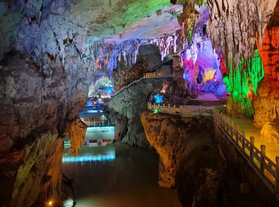 水洞则是燕子洞的另一处奇观。洞内钟乳石林立,形态各异。有的如擎天巨柱,有的如倒挂金钟,有的如仙女下凡,让人不禁感叹大自然的鬼斧神工。在灯光的映照下,钟乳石散发出五彩斑斓的光芒,宛如一个神秘的地下宫殿。乘船游览水洞,仿佛穿越了时光隧道,进入了一个奇幻的世界。