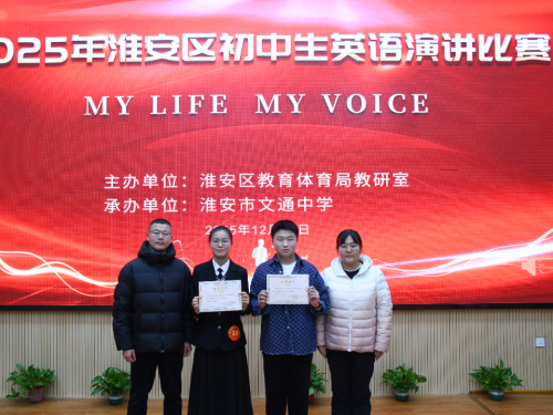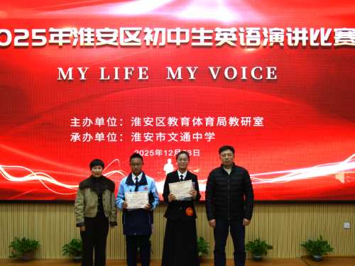 近日,淮安区初中生英语演讲比赛圆满落幕。我校张鑫、张皓宸两位同学凭借扎实的语言功底、流利的口语表达与自信从容的赛场风范,在激烈角逐中脱颖而出。其中,张鑫同学以《My Small Action, Our Big World》为题的演讲斩获特等奖(指导老师:马刚),张皓宸同学凭借《The Magic Key》荣获一等奖(指导老师:余倩)。